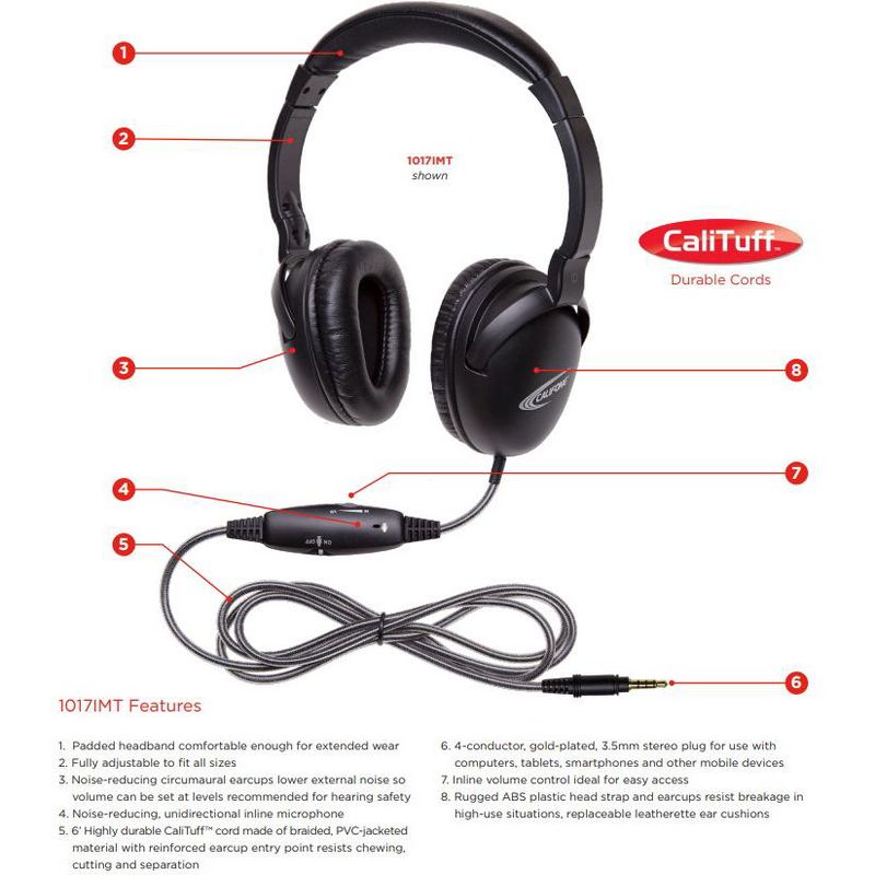 The 1017IMT NeoTech Plus Headset is a versatile, workhorse headset for general-purpose classroom, library and computer lab usage . Padded, adjustable headband is comfortable for extended wear and features noise-reducing, over-ear pads. Noise-reducing, unidirectional, inline microphone captures a student's verbal response, not their neighbors. Includes 6 foot CaliTuff Cord that is braided and PVC covered to resist chewing, cutting or separation. Cord is reinforced where it attaches to the ear cup, has convenient inline volume control and ends with a 3.5mm stereo plug. Headset comes in a heavy-gauge zippered plastic bag with personalized label area, encouraging good classroom hygiene. Compatible with Chromebooks, laptop and desktops PCs and Macs. Comes in Black. 3 year warranty.