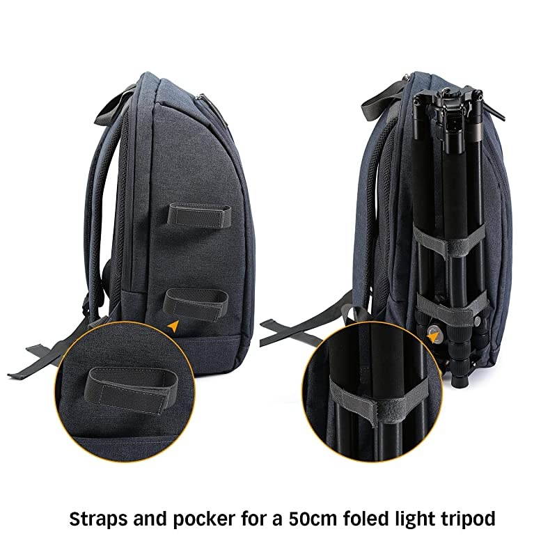 **********Hi-tech Material - Made of ballistic nylon that offer water resistance and protection from harsh temperatures and conditions, Also easy-to-clean*****Tripod Strap - With external tripod straps in the side part, you really can use this backpack for a variety of different shots and locations*****Laptop Compartment -The separate interior space is able to hold up to 15.6 -inch laptops and notebook computers safely, so you can edit your footage as you travel*****Dimension - 17" (H) x 11" (L) x 8" (W). Ideal for anyone on the move, this laptop camera backpack keeps your work or personal gear conveniently portable.