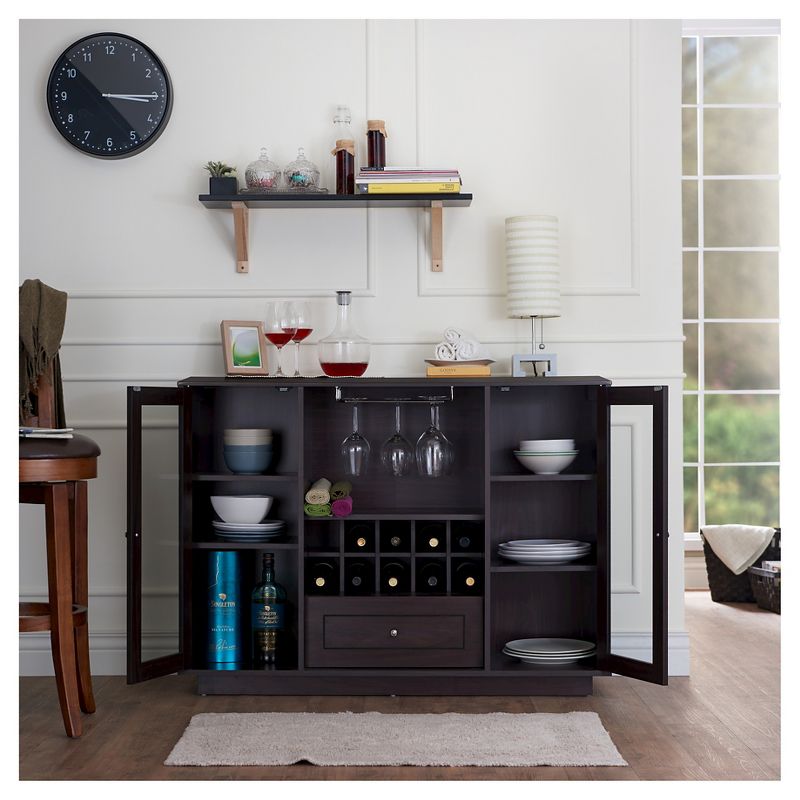 The Candie Multi-Storage Dining Buffet with Glass Cabinets delivers a clean aesthetic with glass paneled cabinets and refined edges. Neatly organize wine and stemware glasses with its built-in racks. Make use of single-drawer storage to stow bar and serveware, as spacious cabinet space holds all your dinnerware. Display decor on the top and complement by showcasing your wine bottles and spirits. Slim and space-efficient, the Espresso finished piece fits perfectly in a modern, upbeat home.