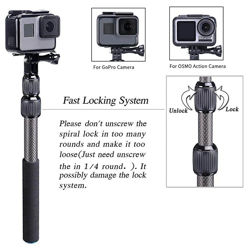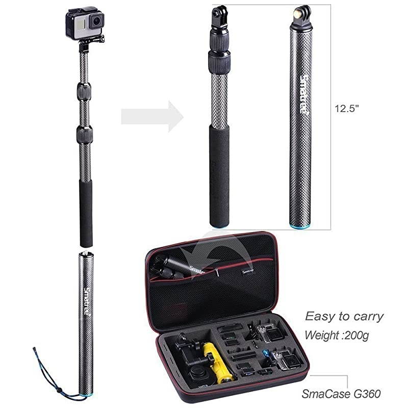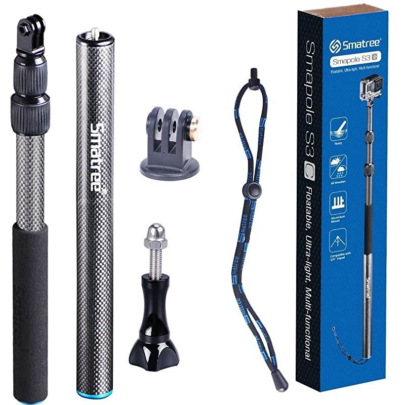 ***** **********Best Quality Guranteed. *****S3C is the longest floating pole for gopro on the current market, reach 39.5" when it fully extend. '''*****S3C is combined with one extendable pole( from 12.5" to 28") and one floating pole( 12.5" ). These two poles can be divided and used separately. '''*****S3C is made of high class carbon fiber to ensure it lighter and stronger. '''*****S3C is 12.5" when it fully folded. It can be loaded in Smacase G360 or most of backpacks. '''*****1x Extendable Pole; 1x Floating Pole; 1x Tripod Mount Adapter; 1x Black Thumbscrew; 1x Ajustable Wrist Strap; 1x User Guide'''