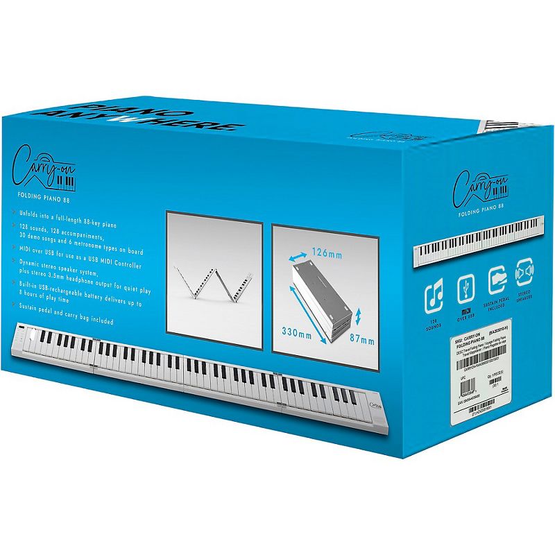 The Carry-On 88-Key Folding Piano and MIDI Controller is a fun, convenient way to take and make music on the go. It offers 88 standard-size keys for real playing feel and muscle memory development, with 128 built-in sounds, 128 built-in rhythms, as well as 30 backing tracks, stereo speakers and much more. With up to 8 hours of normal playing time on a full charge, can really enjoy playing wherever want. When are done, it folds up for easy storage.