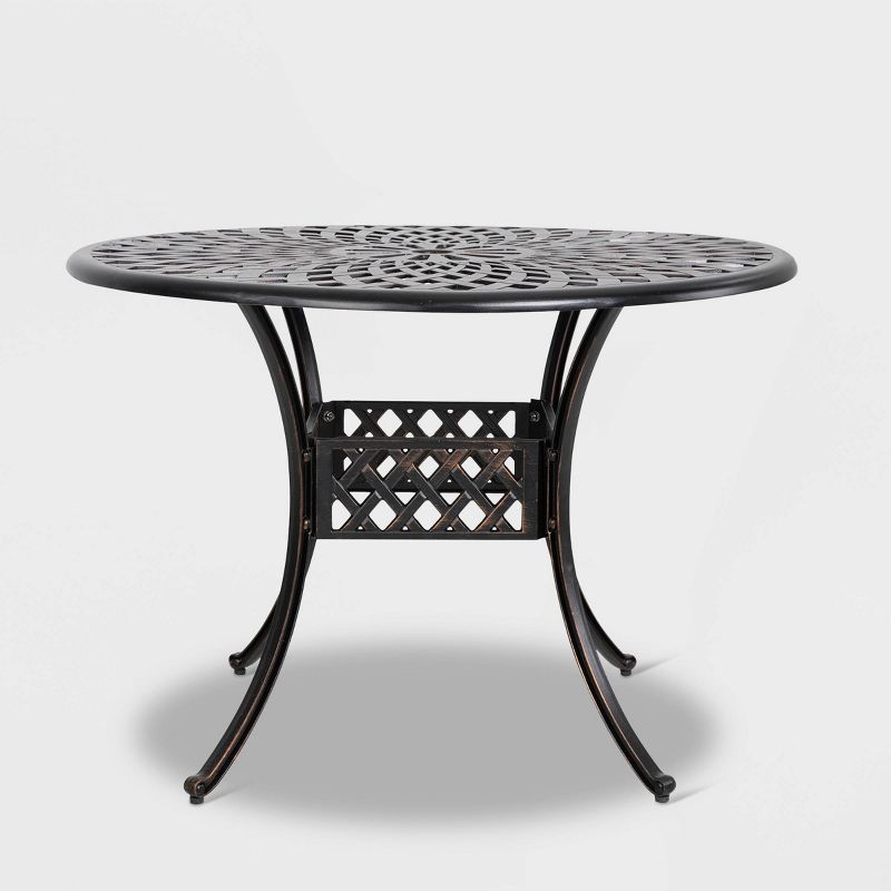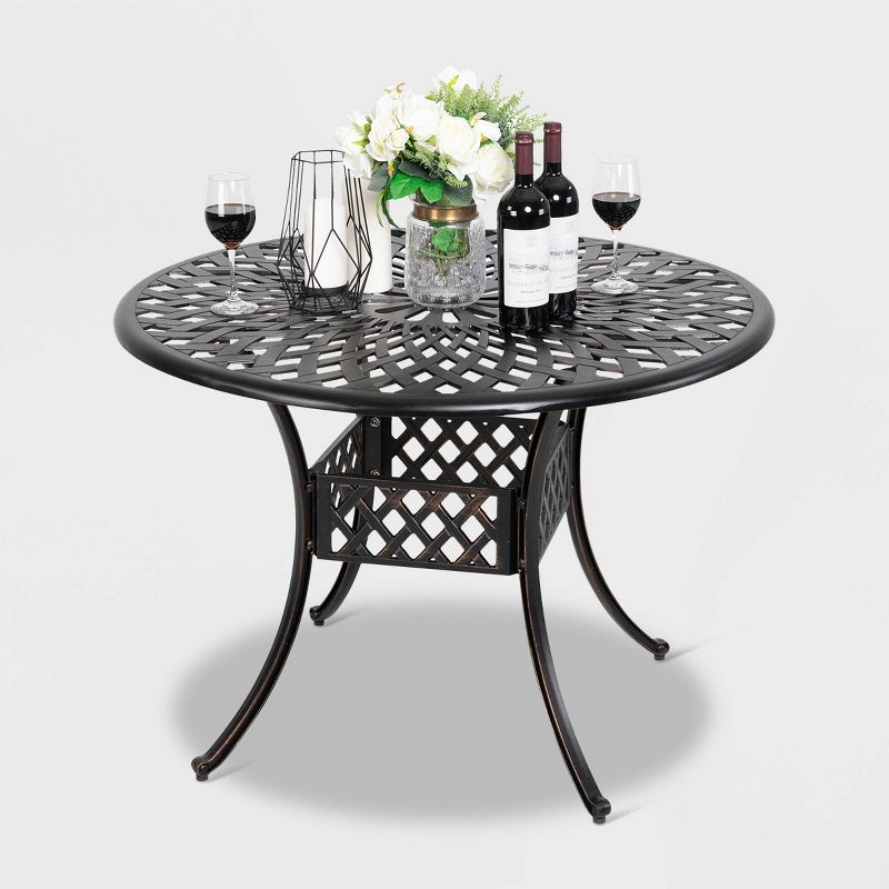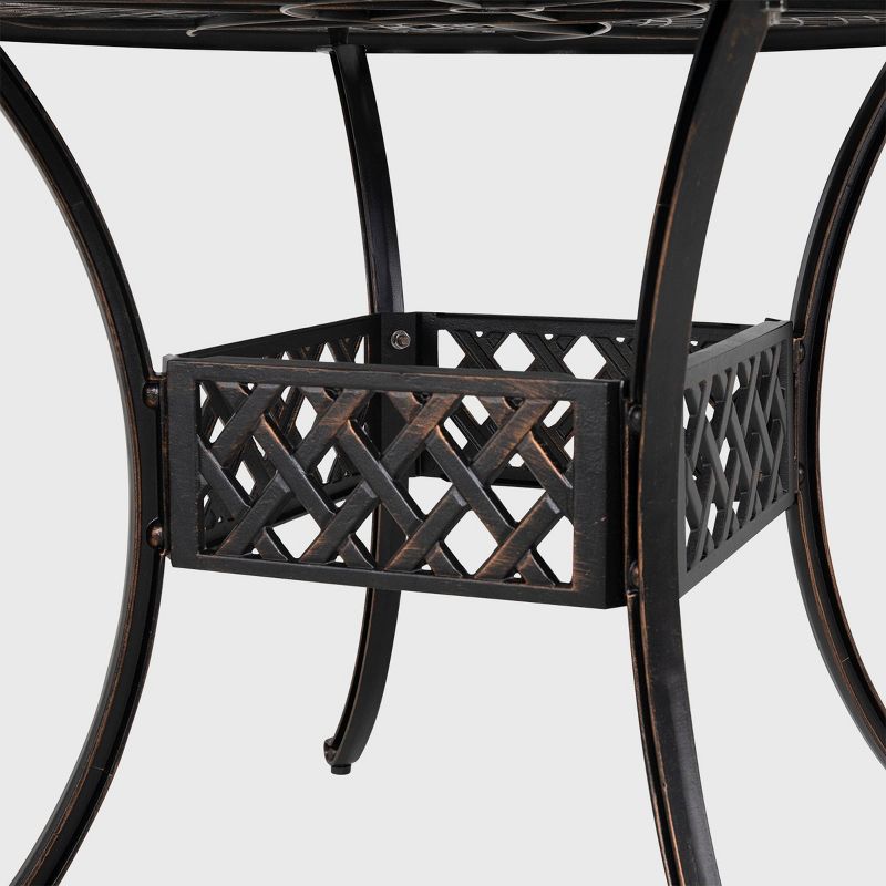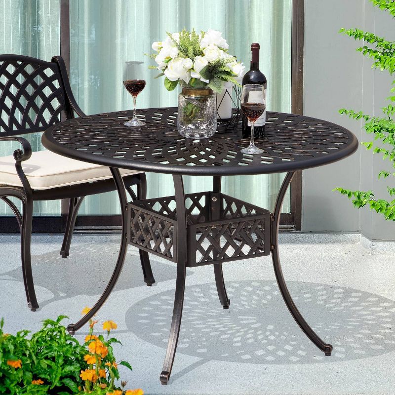 This round dining table is crafted with solid cast aluminum construction. Furnish your deck or patio with this 42 in. round dining table to enjoy generous surface space for long-lasting using. It is in a powder coated finish with hand applied antiqued highlighting, seads with a clear top coat. This intricately designed outdoor patio dining table seats up to 6 guests. It is perfect for family outdoor dinner and hosting get-together for your friends. Its really an elegant addition to your back yard, patio, lawn, deck, garden and any other outdoor area in your home.