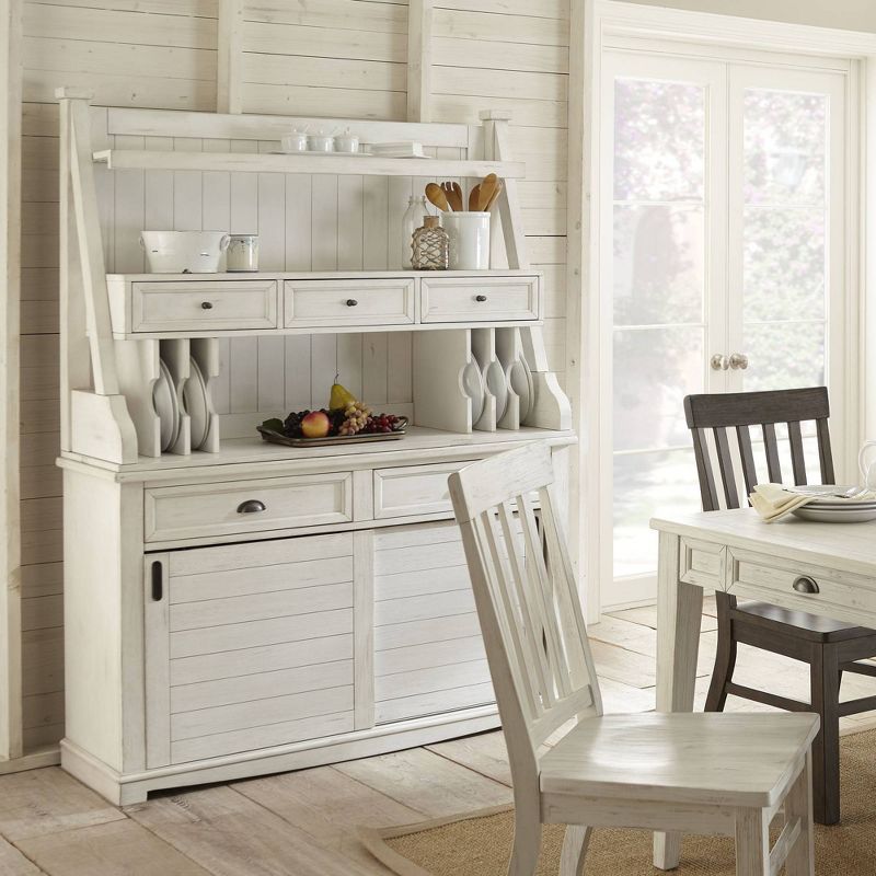 The Cayla Buffet and Hutch from Steve Silver brings charming farmhouse style to your space with its weathered wood finish, while also offering functionality. Host parties or casual gatherings in style with this white buffet server, which provides lovely display and storage space. Two sliding doors provide spacious storage for saucers, bowls, pans and more. Two top drawers give you a great way to store napkins, cutlery and more. The hutch adds additional storage with vertical plate pockets, two open shelves and three small drawers.