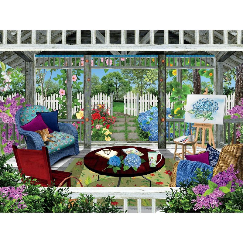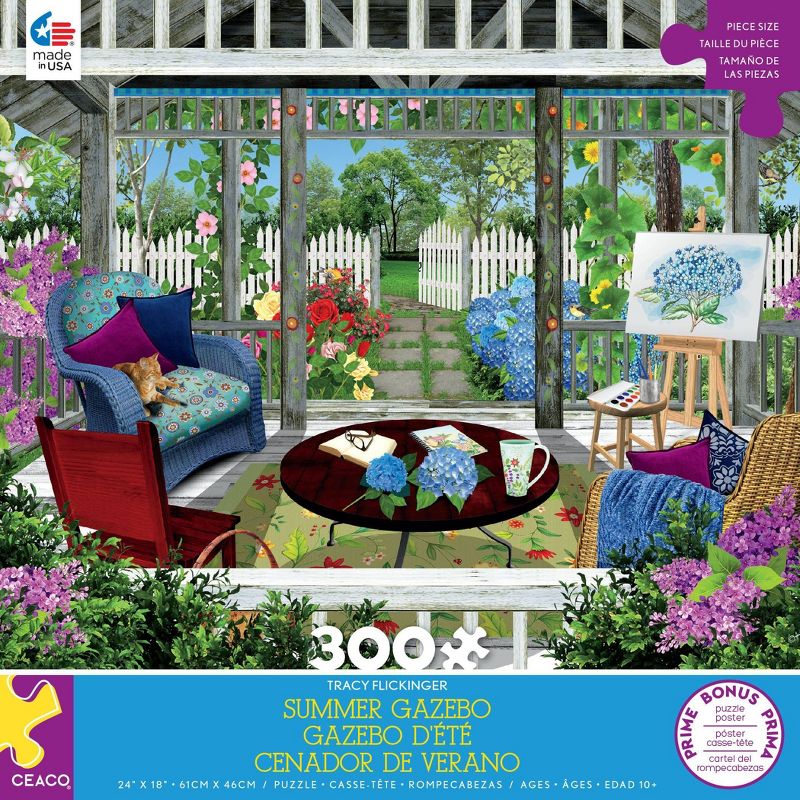This 300 oversized piece puzzle by artist, Tracy Flickinger, depicts a garden gazebo during the summer with an easel and wicker chairs. When completed, this puzzle is 24" x 18" in landscape orientation. A bonus poster of the puzzle image is included! Count on Ceaco for the most Creative, Exciting, and Colorful puzzles since 1987.