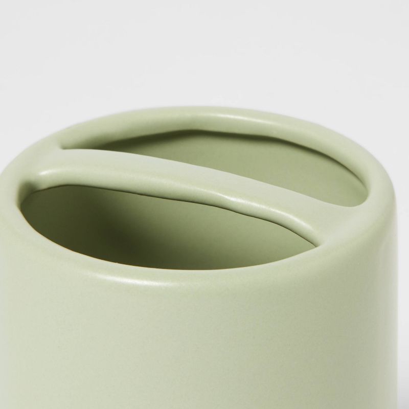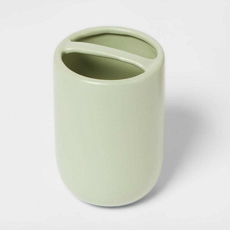 Add understated style and a touch of color to your bathroom with the Ceramic Toothbrush Holder from Project 62™. This toothbrush holder comes in silver-green for a soft look, while the smooth finish lends a touch of timeless style. A divider across the top provides plenty of storage space for multiple toothbrushes, and the compact size fits easily on any sink or counter, making this green toothbrush holder the perfect addition to your mid-century or minimalist-inspired bathroom.
