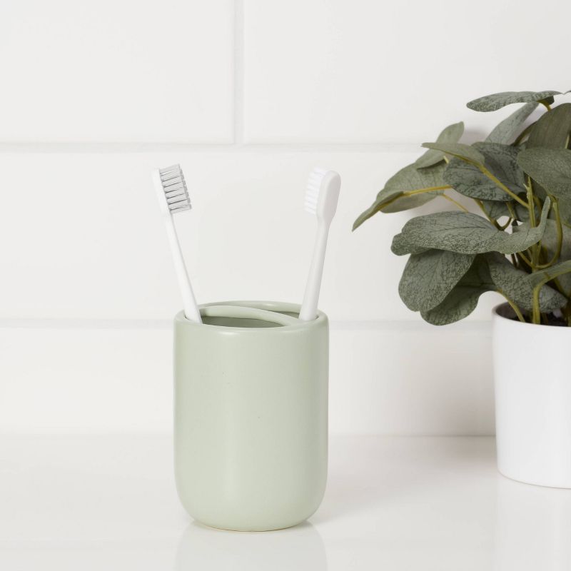 •Sage-green ceramic toothbrush holder has a clean, classic look