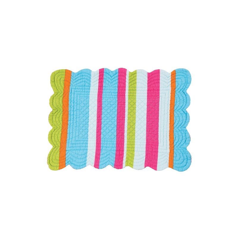 Bring the tropical sunshine and seashells of the beach to your home, without the sand. The Merrit Island quilted tabletop collection features a vibrant scallop seashell pattern in shades of fuchsia, sky blue, tangerine and lime green on a white ground, sure the brighten the room and create a captivating focal point. Reversible to a coordinating colorful stripe pattern, this collection is perfect for a colorful summerlike look. Placemats and table runner are finished with a scalloped edge, crafted of cotton and machine washable for easy care.