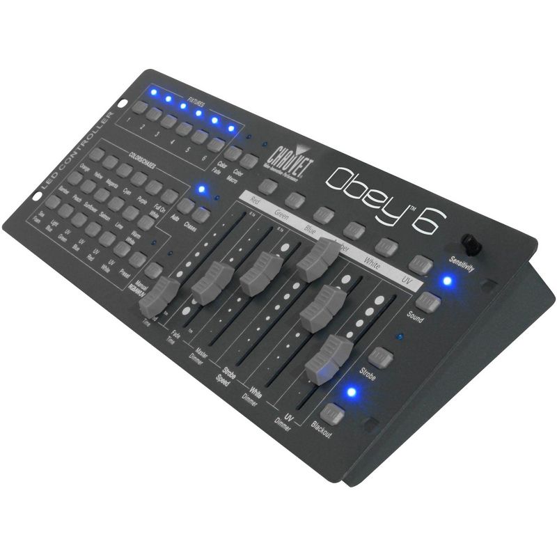 The **Chauvet Obey 6** is a universal, compact controller ready to handle all the complexities of today's lighting fixtures. Capable of controlling up to 6 channels per fixture, the Obeyâ„¢ 6 allows you to control effects by simultaneously operating each fixture in different playback modes, with variable fade times. Increase flexibility with playback options that include manual RGBAWUV, automated and sound-activated model. Increase control with adjustable audio sensitivity, strobe, and blackout effects.