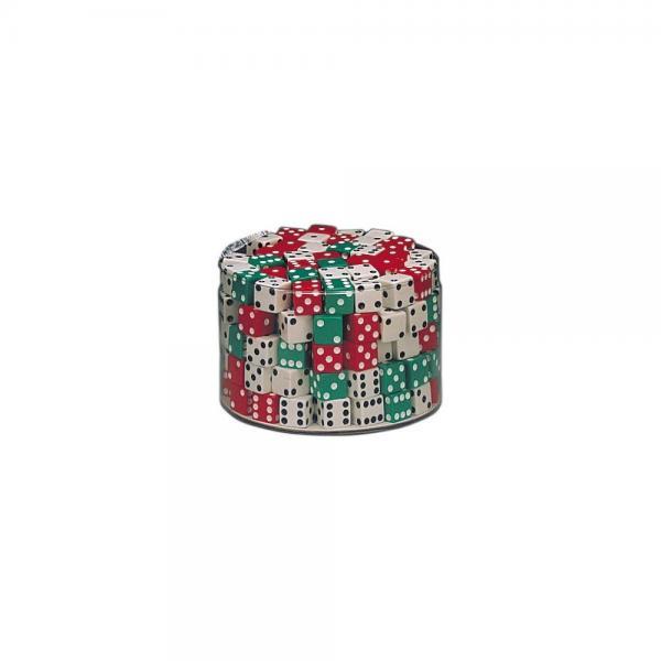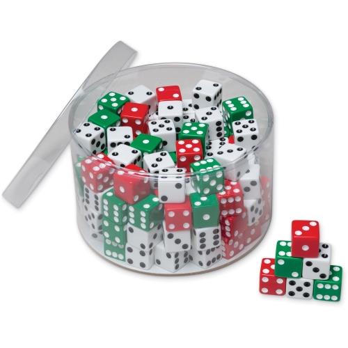 Keep plenty of dice on hand for board games, sorting and counting activities. These red, green and white dice come in sturdy plastic drum for convenient storage. Large dice cubes at 5/8" are easy to toss and read. Color assortment is 72 in white and 36 each in red and green.