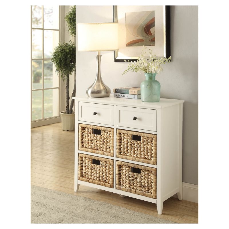 Keep items organized and accessible while keeping the rest of your home clutter-free with this White Chest from Acme Furniture. This six-drawer chest features two traditional drawers and four woven straw drawers with cutout handles. Use the traditional drawers for papers, office supplies or odds and ends, and the basket drawers for linens, clothing and lightweight items.