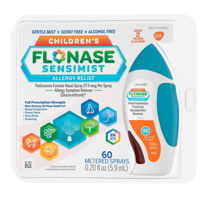 Flonase Sensimist Allergy Relief Spray for Children relieves kids' worst allergy symptoms with a gentle mist they will barely feel. Unlike most allergy medicines, Children's Flonase Sensimist relieves your child’s worst symptoms, including runny nose, sneezing, itchy nose, itchy eyes, watery eyes, sinus discomfort and nasal congestion.* This children's allergy relief medicine has a specially designed bottle with a smaller nozzle for kids’ noses and patented Mist-Pro technology to deliver the allergy medicine, fluticasone furoate, in an ultra-fine mist that is scent free and virtually drip free. The non drowsy kids allergy medicine is formulated for more complete allergy relief to keep kids energized and focused throughout the day. Children's Flonase Sensimist 24 hour allergy relief medicine is formulated for daily use in children ages 2 to 11 years. To use: once daily, place the small nozzle tip inside your child's nose and spray gently. Have them breathe out through their mouth, then repeat in the other nostril.