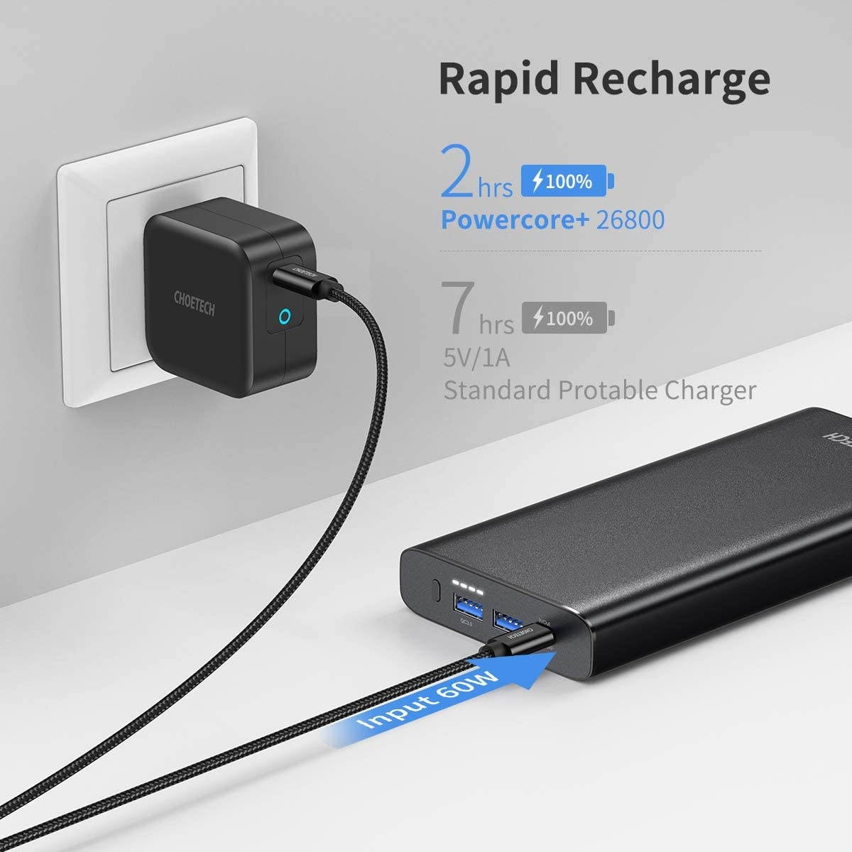 Recharge: The USB-C Port also support input 60W Max, use a PD 60W wall charger (not included) with the included 100W USB-C to C cable to recharge your portable power bank in 2 hours. The charging speed will slow down if you use the power bank to charge other device when rechargingWhat