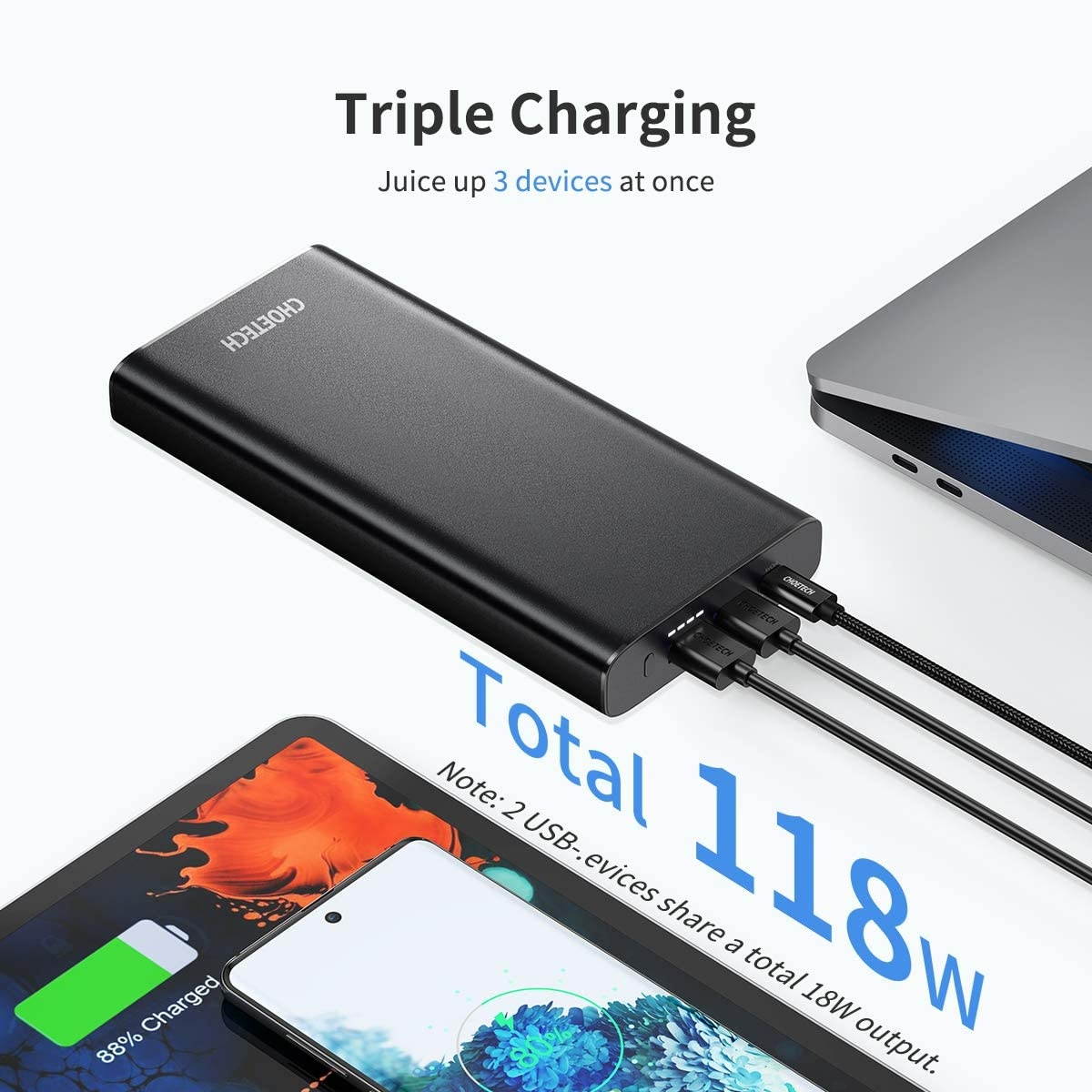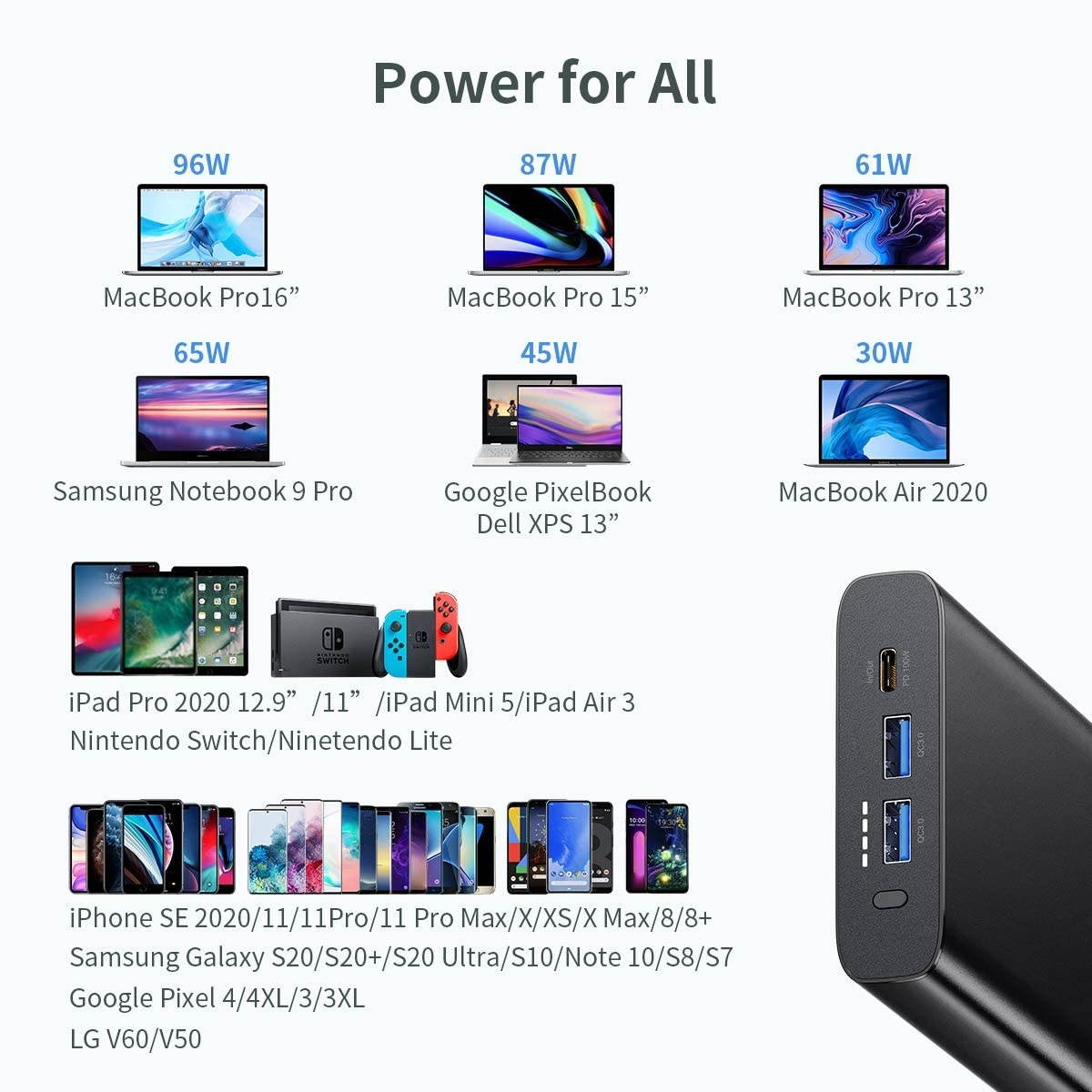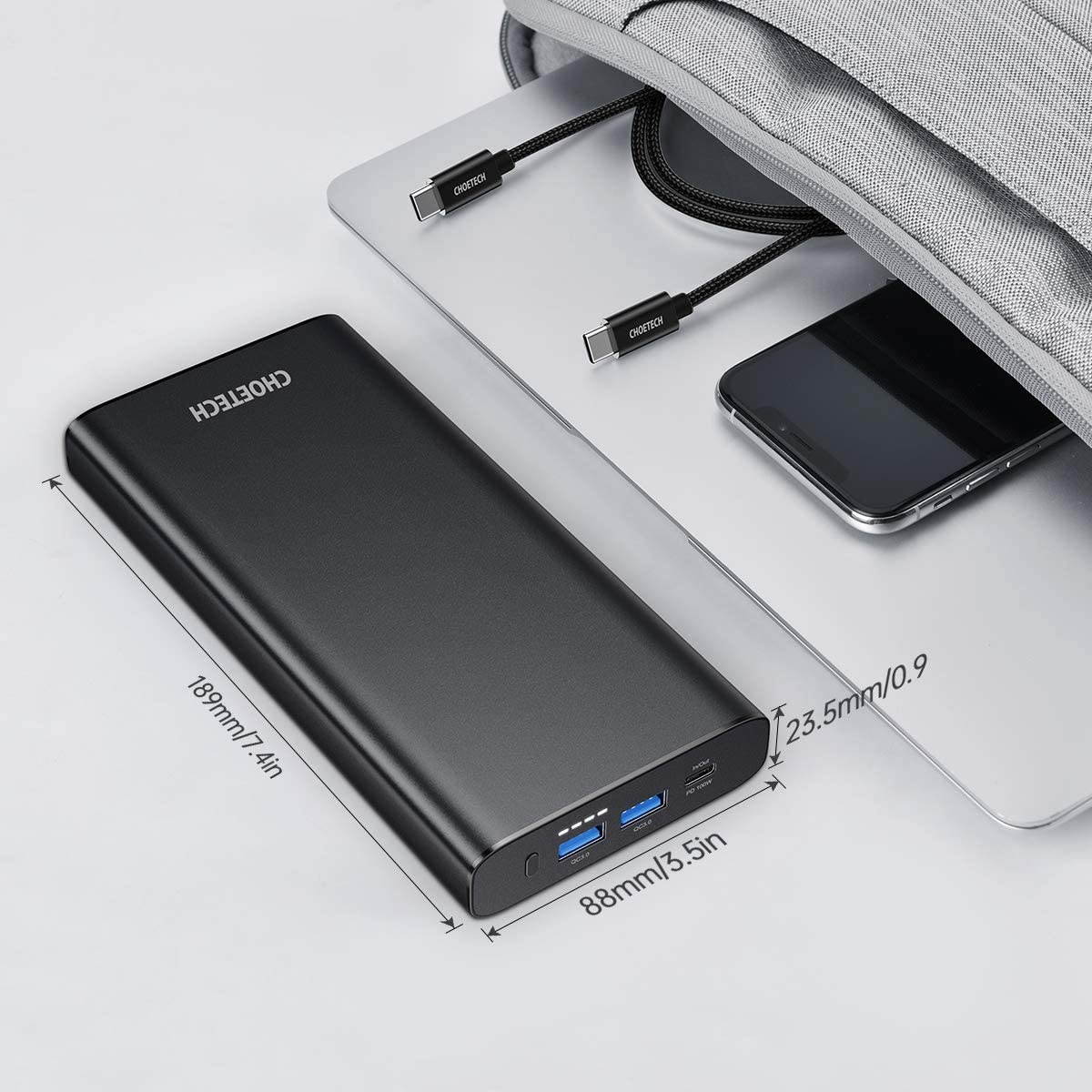 Fast Charger: Ideal charging station for USB-C powered laptop, with 100W USB-C output port, it can quick charge MacBook Pro 16???? from 0 to 60% in only 1 hour, it will automatically identify the devices and smart charge them with proper power from 18W to 100W26800mAh