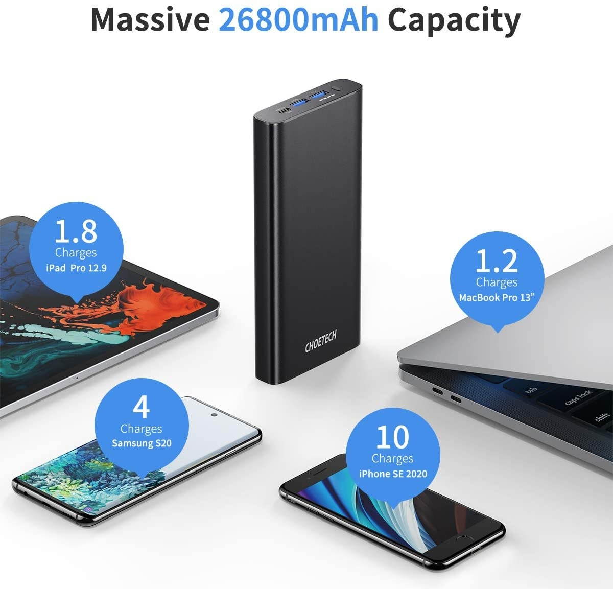 Huge Capacity: Fully charge MacBook Pro 13???? 1.2 times, iPad pro 12.9 ???? 1.6 times, Samsung S20 4 times, iPhone SE 2020 10 times, etc. Never worry about the low capacity of your devices whenever you are during business on the go, meeting, mobile working, travel or gaimg with friend, the 26800mAh power bank will make you feel less anxiousWide