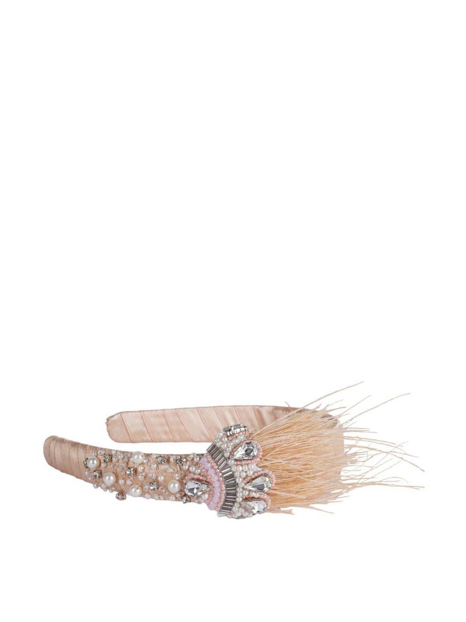 Unleash your inner royalty with this beige hair band from Choko. Handcrafted with utmost care and attention to detail, this women's hair band features a mesmerizing crown motif embellished with fine feathers, sparkling crystal stones, lustrous pearls and intricate beadwork. The hair band is designed to provide a comfortable and secure fit.
