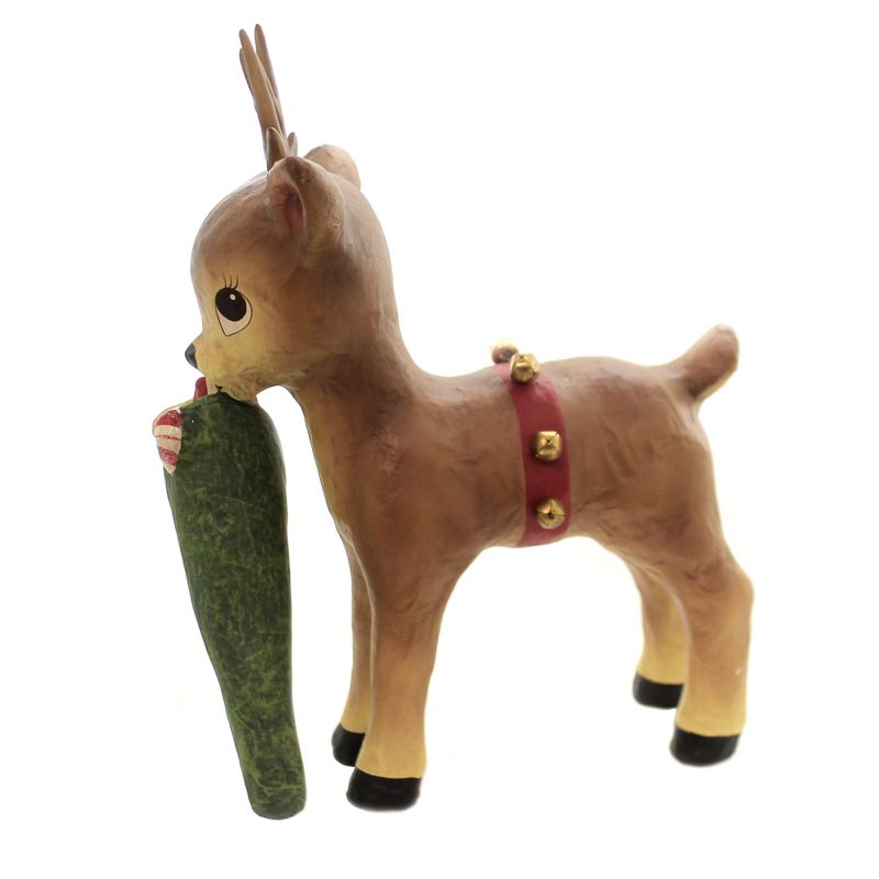 Cute Little Reindeer With A Painted Strap Over Her Back Accented With Jingle Bells Carries A Green Stocking In Her Mouth Filled With A Book, Candy Canes And A Horn.. New. Measurements 14.5 In H X 6.75 In W X 12.0 In D. . Made Of Paper Mache. Assembly Required, No Tools Needed. Indoor Use Only. Imported