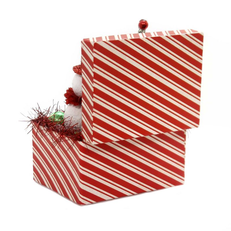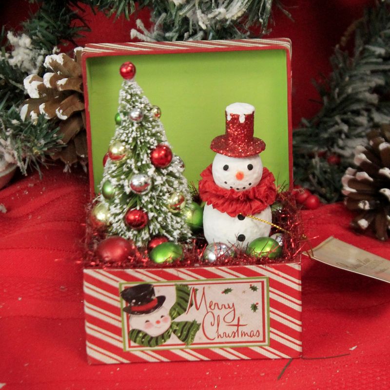 Red And White Candy Cane Stripe Box Filled With A Snow Capped Tree And Snowman Wearing A Red Glittered Top Hat And A Crepe Paper Collar.. New. Measurements 5.0 In H X 4.0 In W X 3.75 In D. . Made Of Polyresin. No Assembly Required. Indoor Use Only. Imported