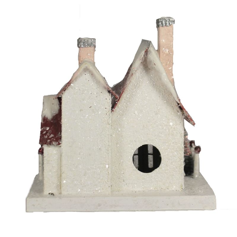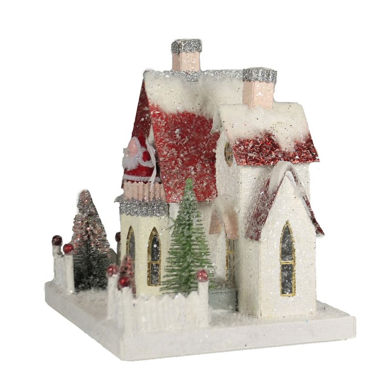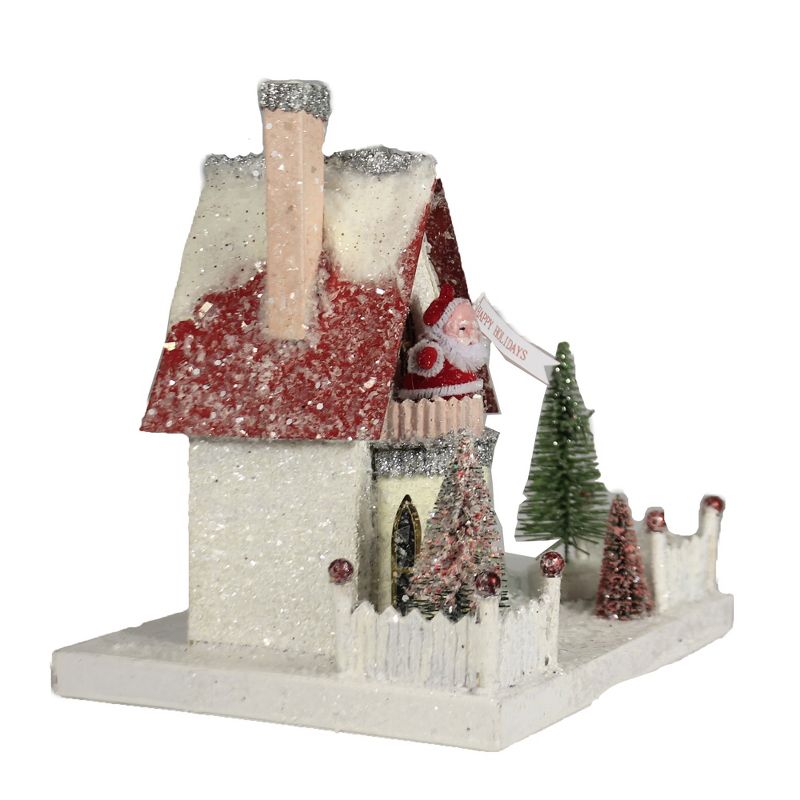 Snow Covered White Cottage With A Red Roof Has 3 Small Bottle Brush Trees In The Front Yard For A Little Festive Holiday Flair. A White Picket Fence Frames The Front Yard. The Front Balcony Hold A Santa Holding A Holiday Banner The Proclaims "Happy Holidays" Hole In Back For Inserting A Light Source. (Not Included). New. Measurements 8.00 In H X 8.00 In W X 6.50 In D. . Made Of Pressed Paper, Glitter, Plastic. No Assembly Required. Indoor Use Only. Imported