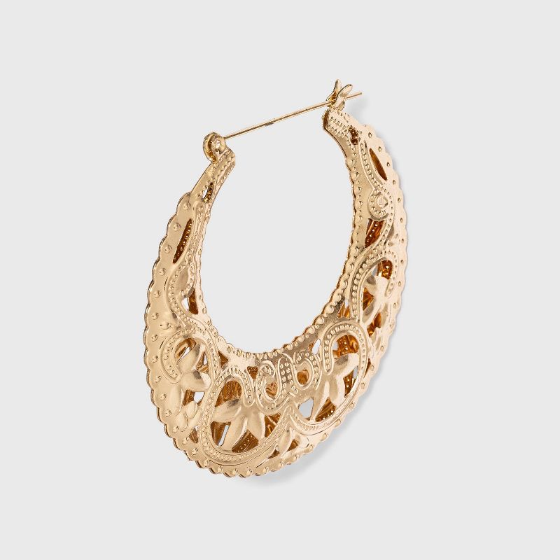 Chunky earrings feature a gold finish with an intricate cutout design. Hinged back makes for secure wear while nickel-free metal is compatible with most skin types. If you’re not satisfied with any Target Owned Brand item, return it within one year with a receipt for an exchange or a refund.