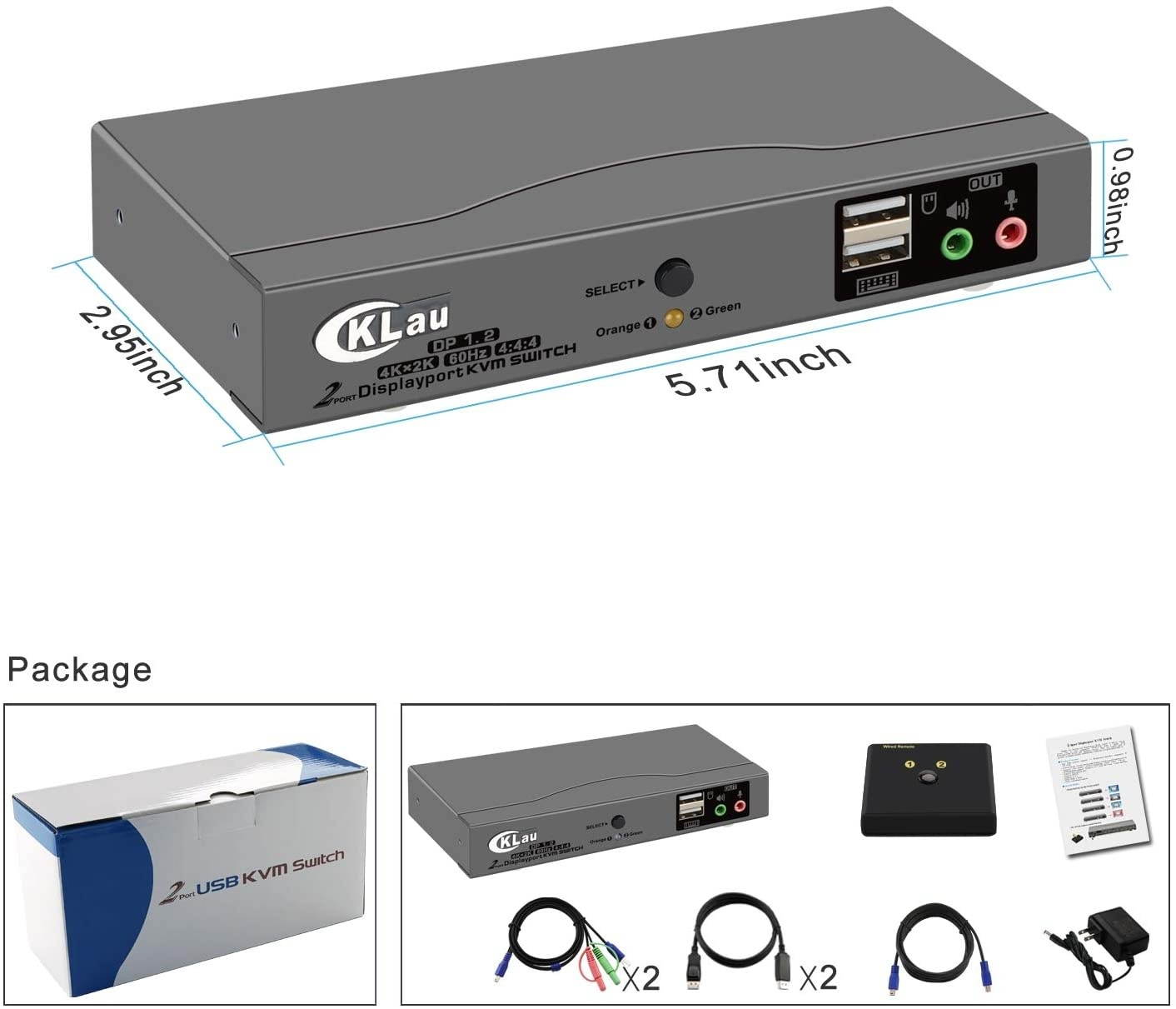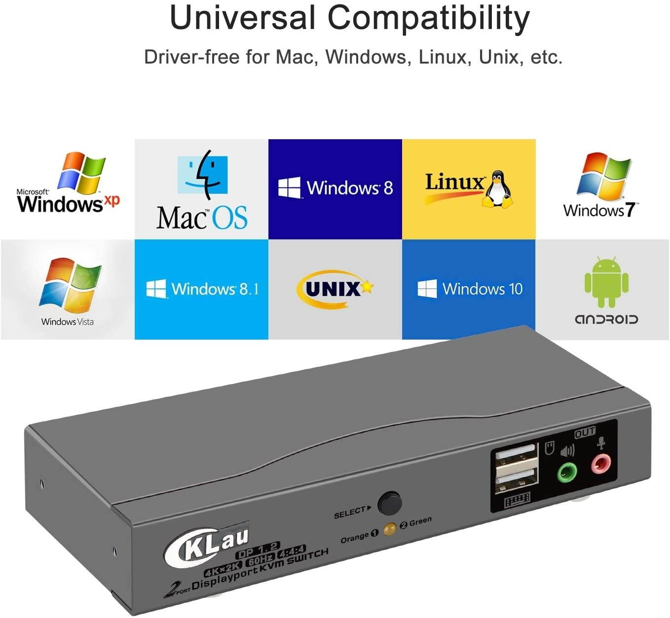 DisplayPort 1.2 version 4K@60Hz Display Port KVM Switch. Supports 16:9 widescreen and 21:9 ultra-wide monitors. Compact 2 Port DisplayPort KVM Switch with KVM cables to control two computers by singal keyboard, monitor, and mouse. 4K resolution up to 4096x2160@60Hz 4:4: 4, compatible 3840x2160@60hz, 1080P, 1080P 3D, 1080I, 720P, 576P, 576I, 480P, 480I. Computer switching via remote switch button or manual push button. Operating systems - Windows 10/7/2000/XP/Vista, Mac, Linux, UNIX, Debian, Fedora, Raspbian, Ubuntu, and other systems