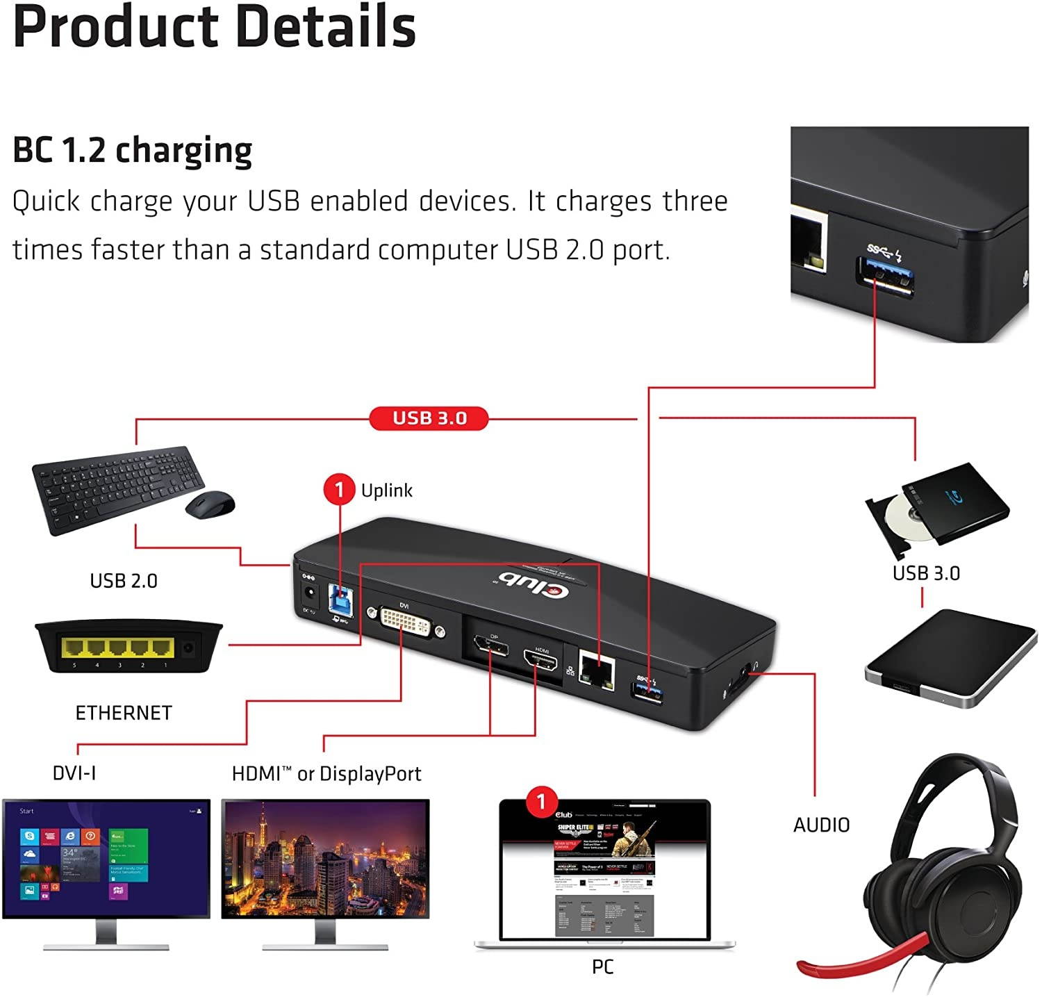 CLUB 3D versatile USB 3.0 4K Docking Station is designed for extra connectivity demands. With the docking station, you can extend the connection of a computer to more USB peripherals, Ethernet network, the speaker and the microphone through one single USB cable.