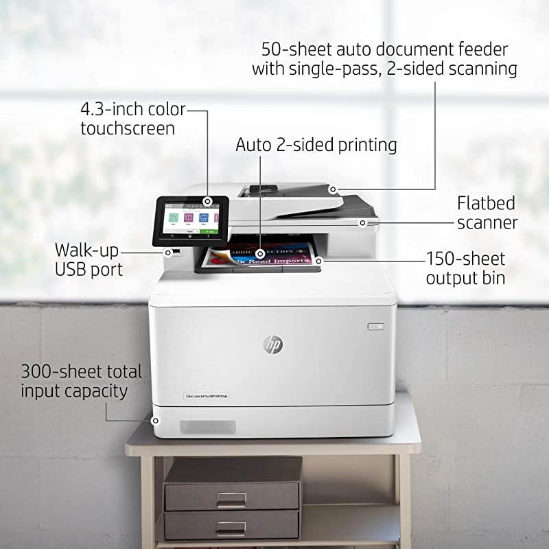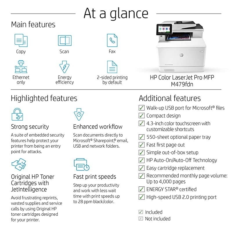 Style: PrinterIt's built to keep your business moving forwardthe color LaserJet Pro MFP M479fdn keeps up with how you actually work, collaborate, and get things done. With fast print, scan, copy, and fax capabilities, best-in-class security, and automated workflows, This multifunction color laser printer is designed to let you focus your time on growing your business and staying ahead of the competition. Maximize productivity with an intuitive 4. 3" Color touchscreen control panel, and print files right off your USB drive. This color laser printer is also designed with the environment in mind; save up to 18% energy over prior products without compromising productivity, and help save paper right out of the box with the default paper savings mode.