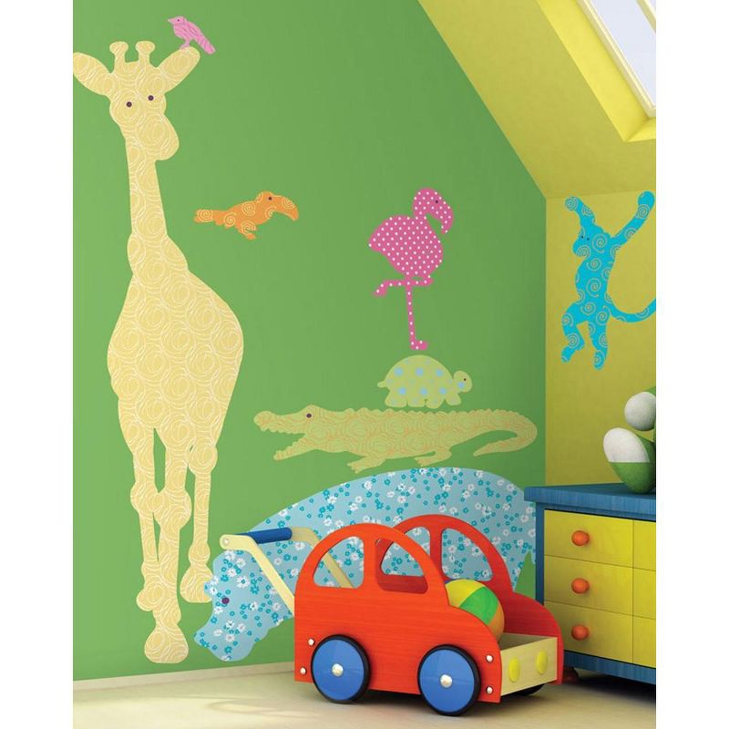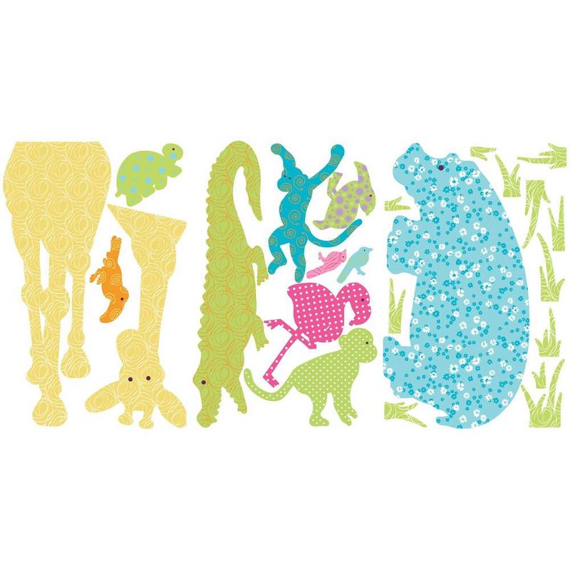 This product is printed on opaque material for optimum color brightness. Suitable for any wall color. ... These fun and hip patterned animal silhouette wall decals will make a big statement in any kid's room or nursery! A giraffe, hippo, crocodile, flamingo, and even a playful monkey or two will add life and color to any drab, boring space. The decals apply easily in manageable pieces, and can be removed or repositioned without peeling away the paint or leaving behind any sticky residue. They're a great choice for bedrooms where wallpaper or paint isn't an option, or for jungle-themed nurseries that need a pop of color! ... Contents: One large Colorful Animals wall accent stickers of varying sizes.; The largest (giraffe) sticker measures 66.5 x 19 inches (168.9 cm x 48.26 cm).; The smallest (birds) sticker measures 5 x 4 inches (12.7 cm x 10.16 cm).