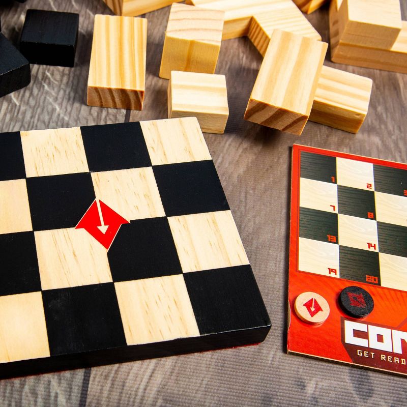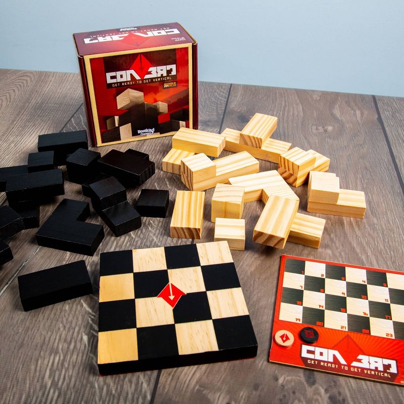 Convert by Breaking Games. Get ready to get vertical! Take the addicting play of Tetris, and the accessibility of Connect 4 and you get Convert, a game for two players, ages six and up. In this clever game, use spatial reasoning to place chunky wooden blocks for points. Every row will score points, combined with the added bonus of territory points at the end!