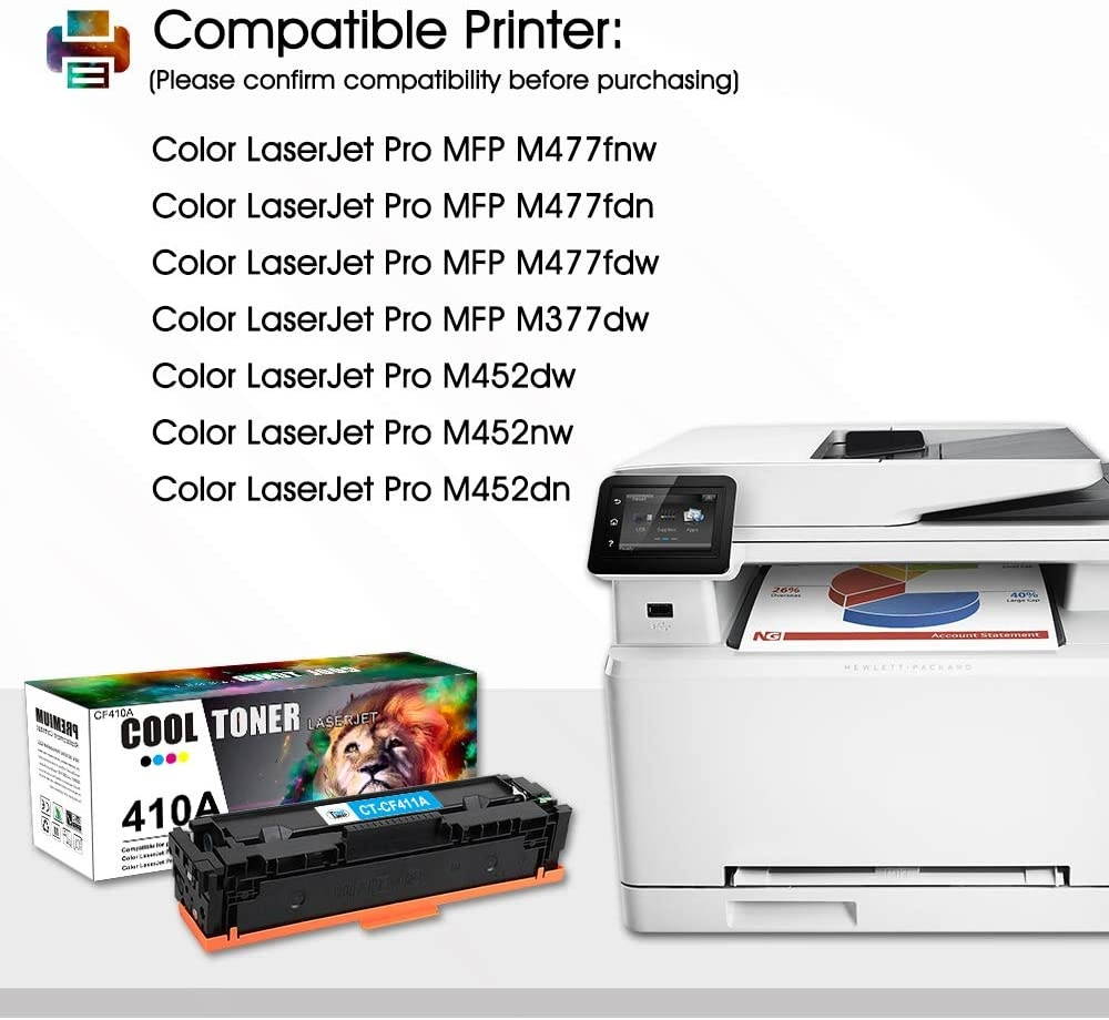Printer Model: HP Color LaserJet Pro MFP M477fnwHP Color LaserJet Pro MFP M477fdwHP Color LaserJet Pro MFP M477fdnHP Color LaserJet Pro M452dnHP Color LaserJet Pro M452nwHP Color LaserJet Pro M452dwHP Color LaserJet Pro M377dwCool Toner Compatible for HP 410X TonerCool Toner Compatible for HP 410A TonerCool Toner Compatible for HP 410A TonerCool Toner Compatible for HP CF410A TonerCool Toner Compatible for HP CF410A TonerColorBlack, Cyan, Yellow, MagentaBlack, Cyan, Yellow, MagentaBlack, Black, Cyan, Yellow, MagentaBlackBlackPack4 Packs4 Packs5 Packs1 Pack2 PacksPage YieldBlack: 6, 500 /