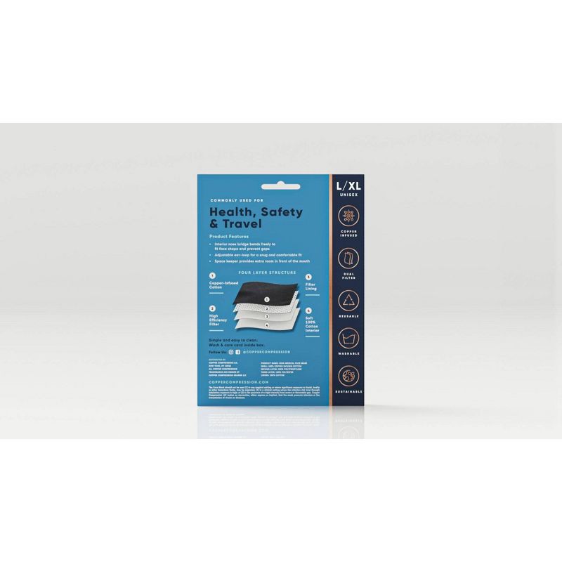 Copper Compression's Copper Infused Face Mask features a multiple layer structure which blocks fine particulate matter. The anti-bacterial effectiveness of Copper never washes off! Comfortable for all day use.