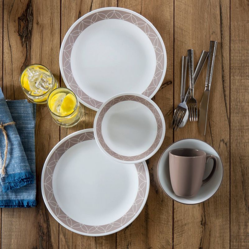 Warm color and sleek, interlacing arcs give this dinnerware set a modern accent. In a sophisticated mix of modern design and welcoming warmth, this dinnerware set features a lattice of intertwining arcs and softly muted shades of taupe. The neutral palette and dynamic motif make an effortless style statement for dining and entertaining