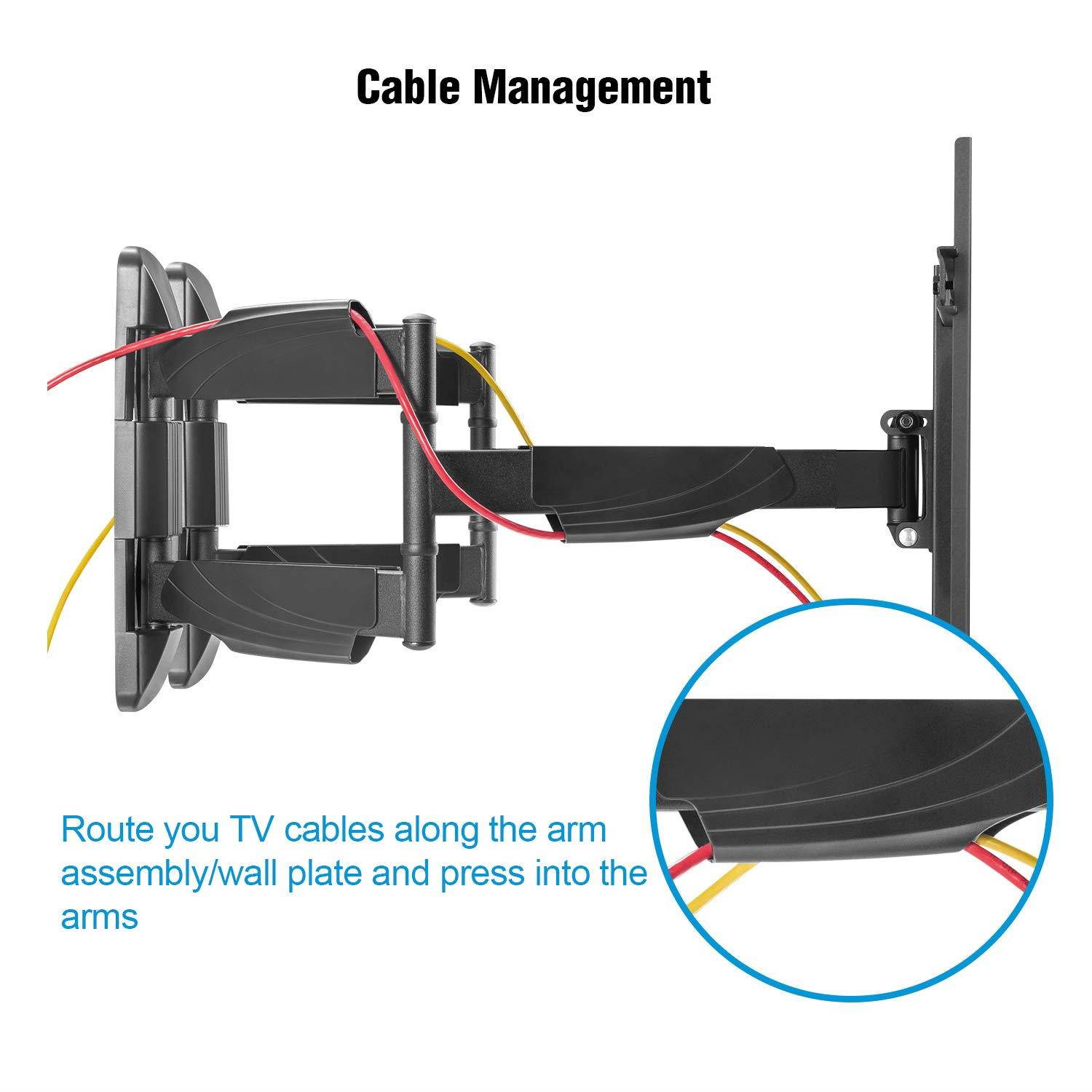 HIDDEN CABLE MANAGEMENT SYSTEM - This TV wall mount comes equipped with plastic threading slot that allows you to route your TV cables through the arm so you don’t have to worry about ugly, tangly wires being on display and in the way
