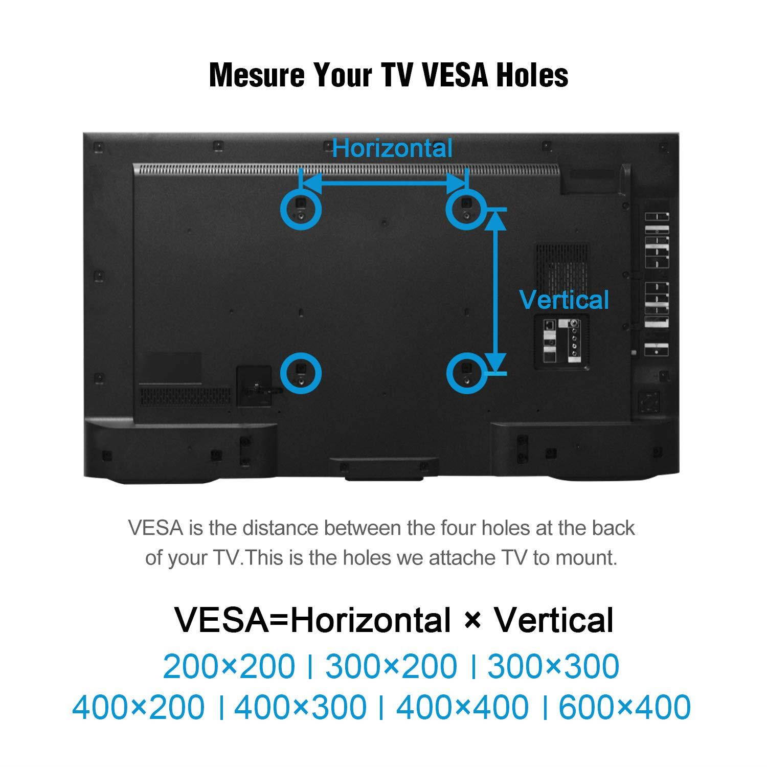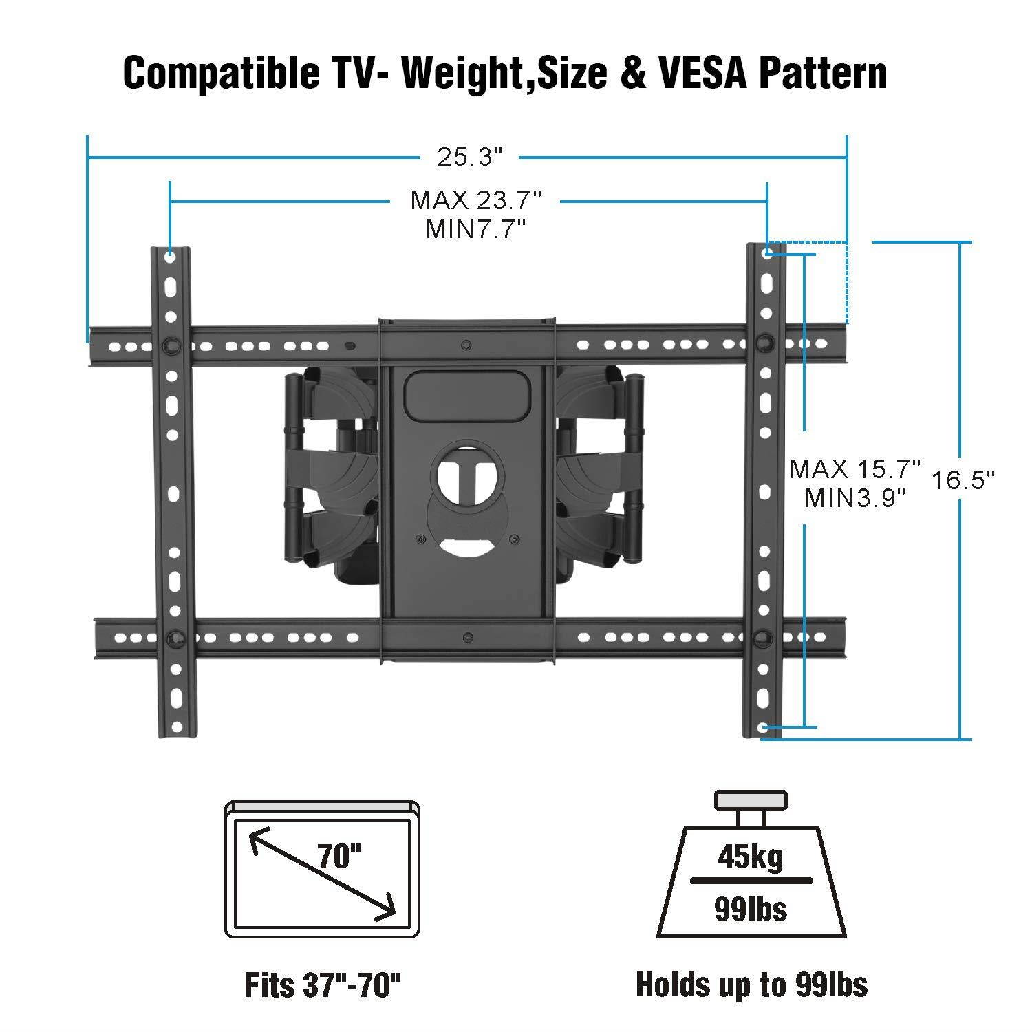 UNIVERSAL TV COMPATIBILITY - Our corner TV bracket fits most 37-70”TVs weighing up to 99lbs/45kgs. Suitable for VESA sizes (mounting hole pattern) - 200x200/300×200/300×300/400×200/400×300/400×400/600×400mm
