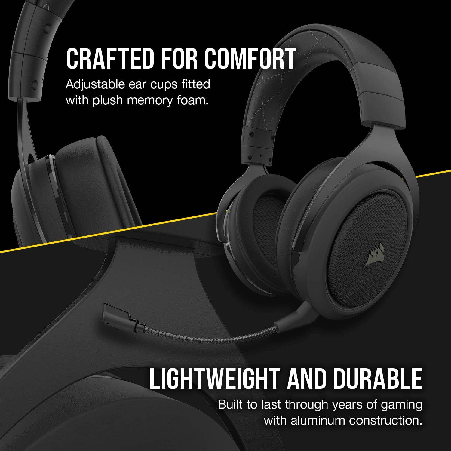 Corsair HS70 Pro Wireless Gaming Headset - 7.1 Surround Sound Headphones for PC, PS5, and PS4 - Discord Certified - 50mm Drivers \u2013 Carbon (CA-9011211-NA)The Corsair HS70 Pro Wireless gaming headset delivers both comfort and quality with memory foam ear pads and custom-tuned 50mm neodymium audio drivers, built to last thanks to its lightweight and durable construction^^>Connect to your PC or PS4 with low-latency 2^^>4GHz wireless, and make sure you\u2019re heard with a fully detachable, noise-cancelling unidirectional microphone^^>Immerse yourself in 7^^>1 surround sound on the PC, with up to 16 hours of battery life and up to 40ft of wireless range^^>On-ear volume and mute controls make it easy for adjustment audio on-the-fly, while Corsair iCUE software lets you fine-tune all of your settings from a single intuitive interface^^>Tech Support