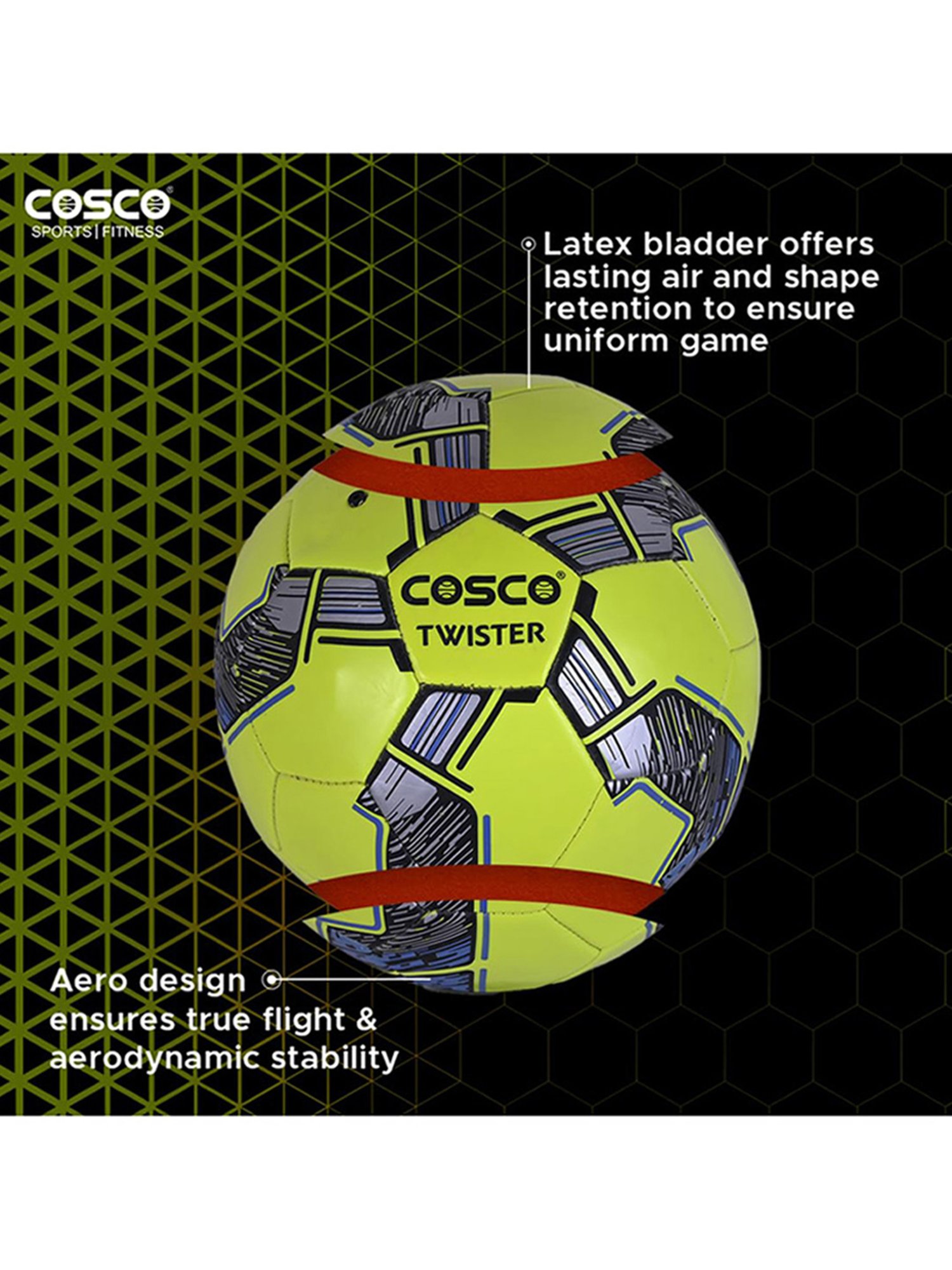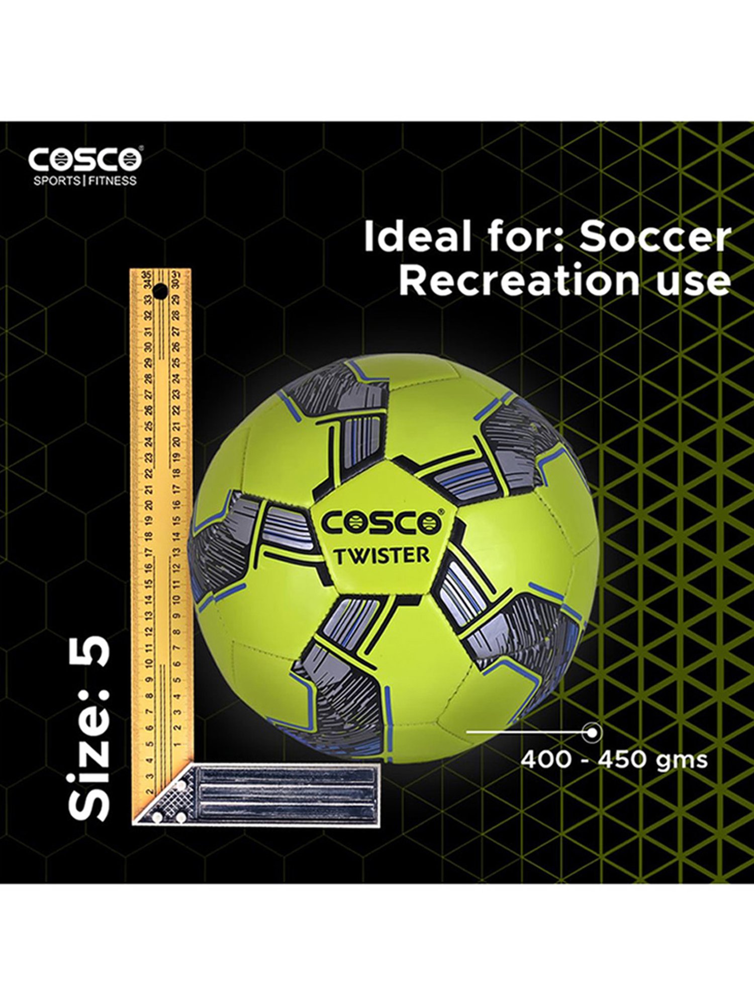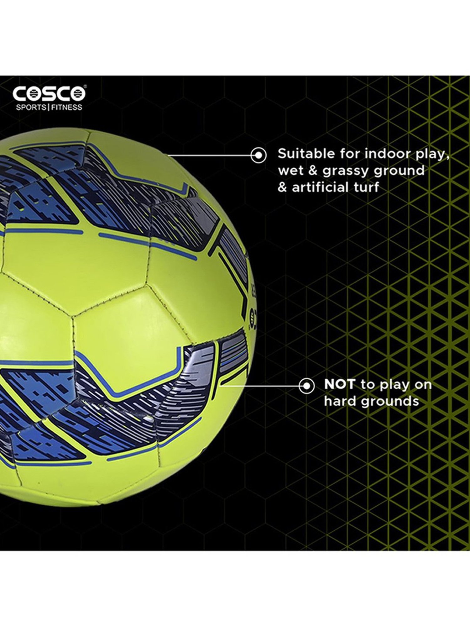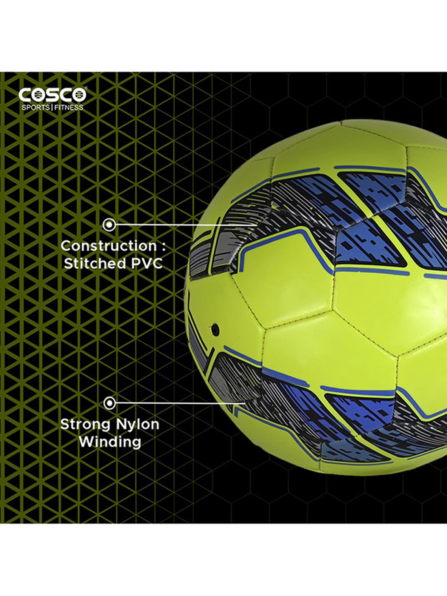 Incorporate this football from Cosco in your fitness routine and stay active in a fun way. This green 5-sized polyvinyl chloride essential has a weight, height, length and width of 569.9995346 gms, 21.49999998 cm, 11.89999999 cm and 21.29999998 cm respectively. Latex bladder offers lasting air and shape retention to ensure uniform game.