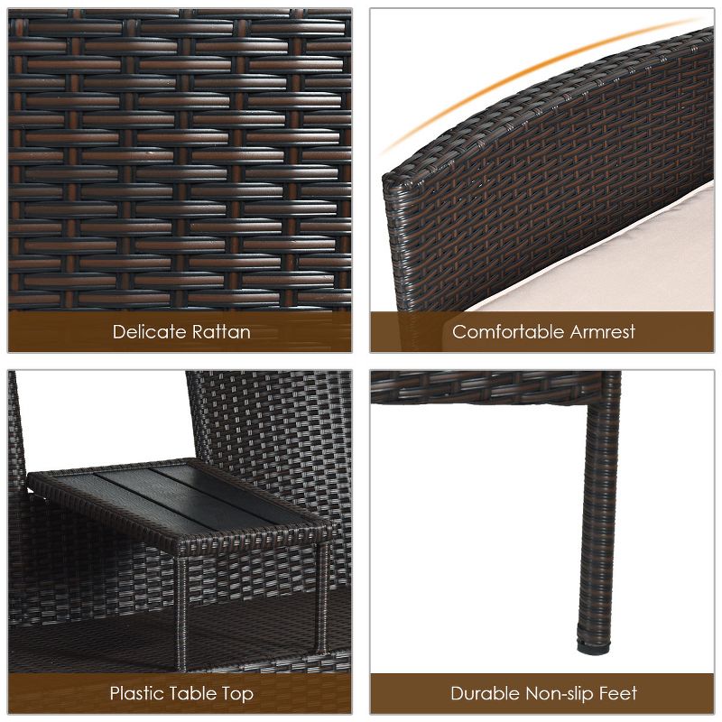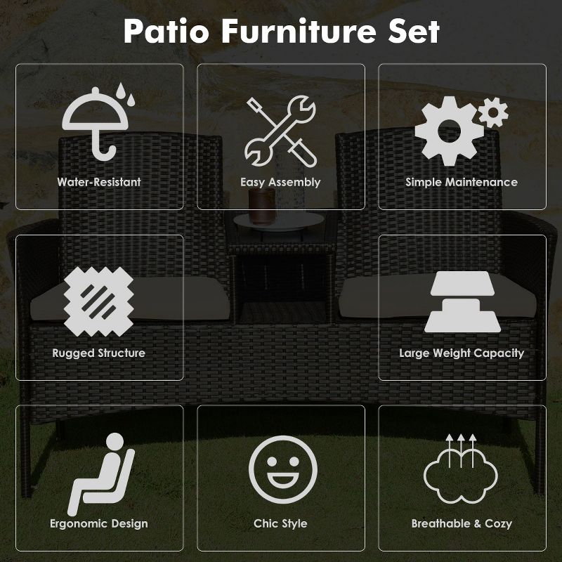 Enjoy outdoor leisure time with this patio conversation set. Featuring rugged structure and high-quality PE rattan, this patio furniture set is built to stand up to harsh weather conditions and great for outdoor using. In addition, this patio loveseat set comes with a coffee table between 2 seats that provide enough space for books and cups. And this patio loveseat sofa set is more practical than traditional loveseat sofa and more space-saving than 3-piece patio furniture set. Besides, wide armrest and curved backrest ensures you will love the comfortable feel of the patio conversation. The thickly cushioned patio sofa set chairs for maximum comfort and excellent seating experience. By the way, this conversation is easy assembly. . Specification: Color: Mix Brown .