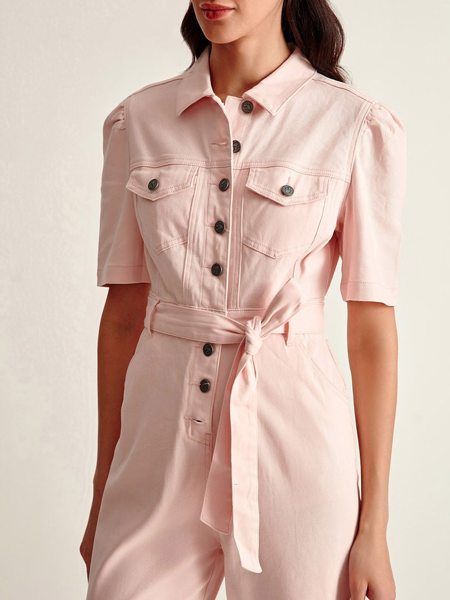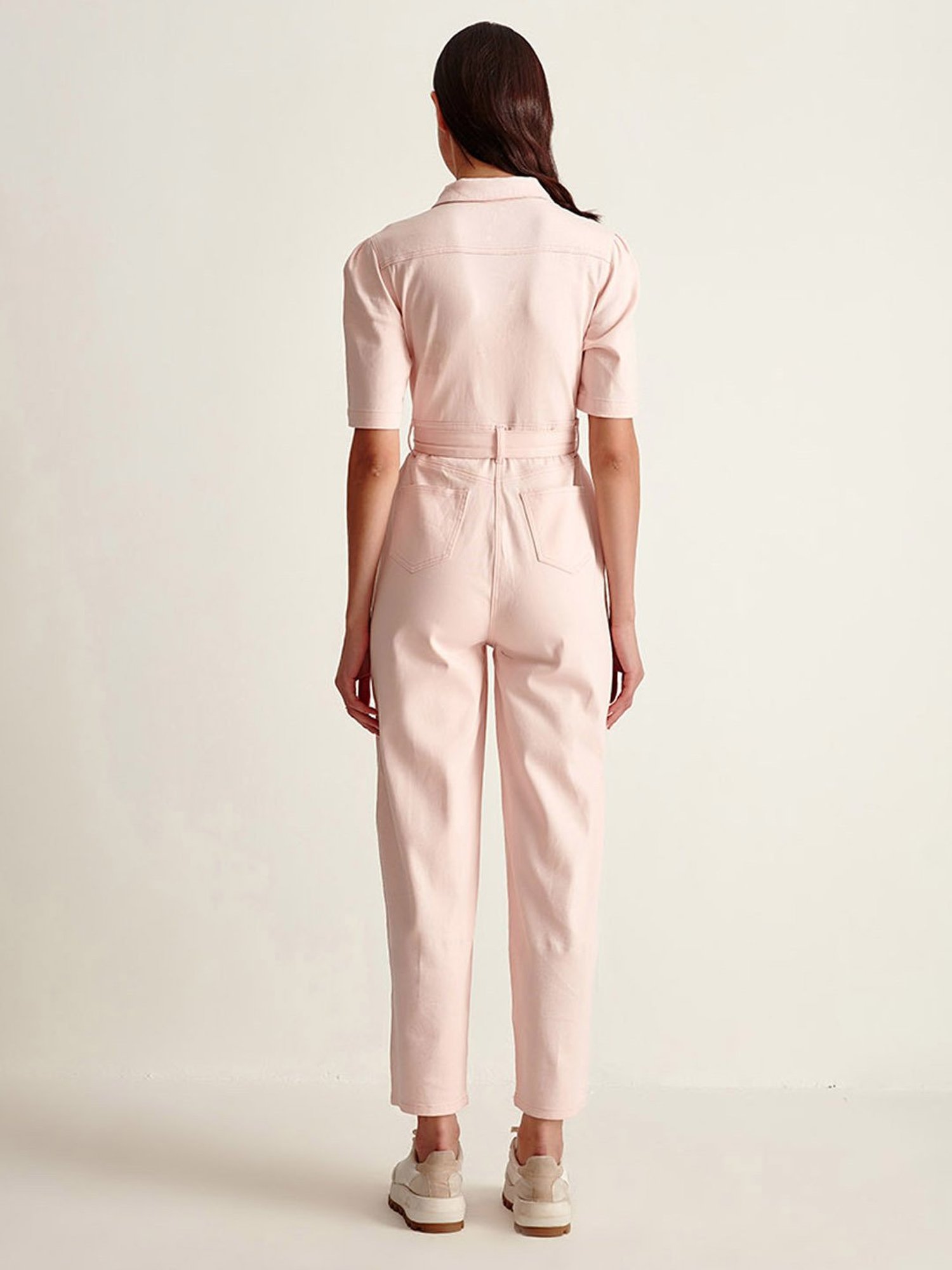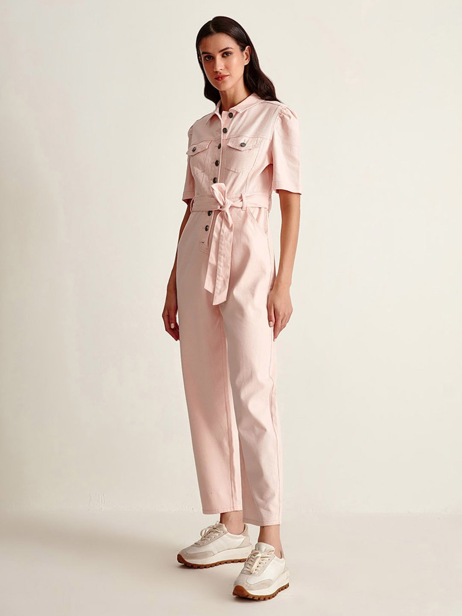 Leave the audience in awe with this stylish pink denim jumpsuit from the latest collection of Cover Story. Finely crafted in top quality cotton for an alluring sheen, a smooth, feather-like feel and unmatched drape, it's chic color-block pattern makes it a must-have this new season. Pair it with matching sneakers for a stunning look.
