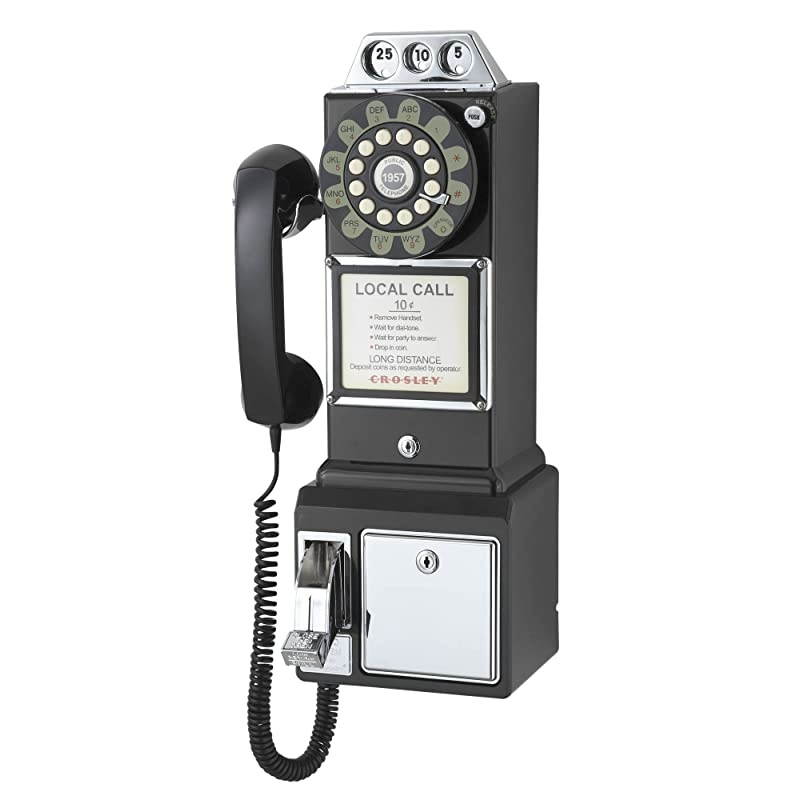 Color: Black The very familiar 3-slot style payphone was first introduced in the 1950's and remained virtually unchanged until 1965. This appropriately christened prepay-style pay station will take you back to the days of old fashioned phone booths and 10-cent phone calls. Believe it or not, its predecessor was a post pay-style phone that actually allowed the caller to place their call and then pay once finished. While you don't have to pay for your calls with this replica, you will enjoy the functional coin slots complete with jingle as your money is deposited into the coin bank in the base of the unit. From the ManufacturerThe very familiar three-slot style pay phone was first introduced in the 1950's and remained virtually unchanged until 1965. This appropriately christened prepay-style pay station will take you back to the days of old fashioned phone booths and 10-cent phone calls. Believe it or not, its predecessor was a post pay-style phone that actually allowed the caller to place their call and then pay once finished. While you don't have to pay for your calls with this replica, you will enjoy the functional coin slots complete with jingle as your money is deposited into the coin bank in the base of the unit.