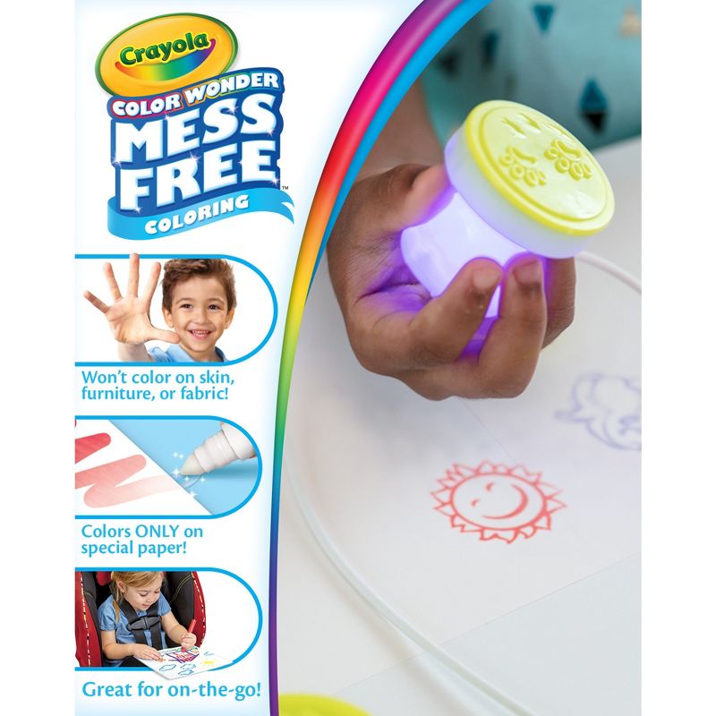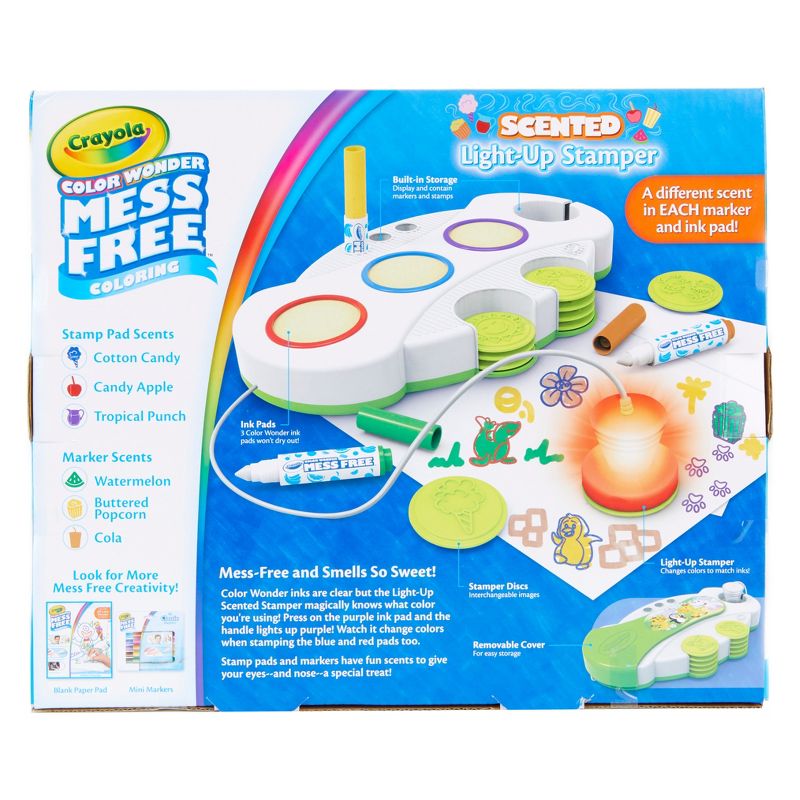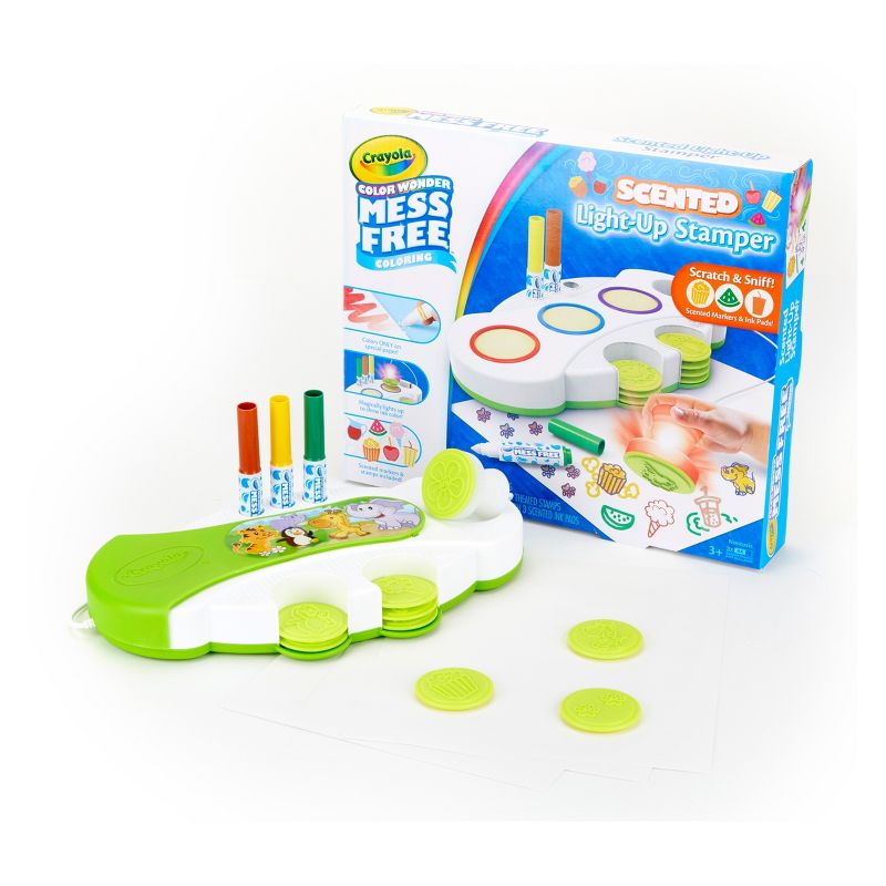 The Crayola Color Wonder Light-Up Stamper lets kids explore the fun of stamping-without making a mess. Like magic, the stamper handle lights up to indicate which color is being used. Includes 3 scented Color Wonder inks, Red, Blue and Purple. The inks are clear and make marks only on the special Color Wonder paper, so clothes and hands stay mess-free. The set includes Zoo themed stamps that let kids create their own tigers, elephants and more! The stamper can also be used with other items from the Color Wonder line for more creative possibilities. Also includes 3 Color Wonder Pipsqueaks Markers in Brown, Green and Yellow.
