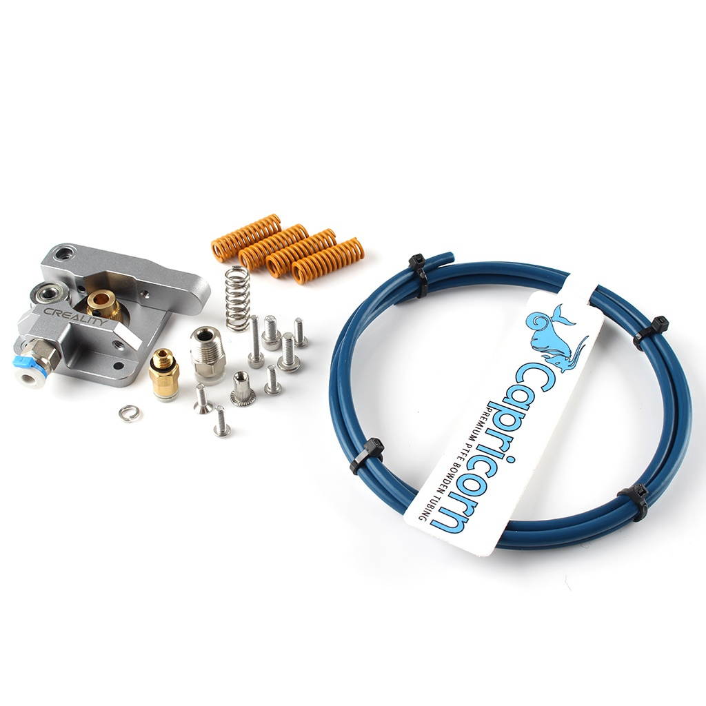 Overview: Upgraded version of Creality full metal MK-8 extruder feeder drive 1.75 mm filament, suitable for Ender 3/3 Pro/3 X, Ender 5/5 Plus/5 Pro, CR-10S, CR-10 Plus, CR 20/20 Pro, CR-X. The 1*1 meter original Capricorn XS Serious Bowden PTFE tube has the lowest friction on the market. Less friction means stronger reaction force, smaller retraction rate, more accurate printing, less sliding, abrasion and tearing on the extruder, and less clogging when printing thick filaments (such as some wood filler or iron filler). One pair-Small and large pneumatic couplers secure the PTFE in the extruder and Hotend. 4 bed horizontal springs to ensure the bed level is stable.