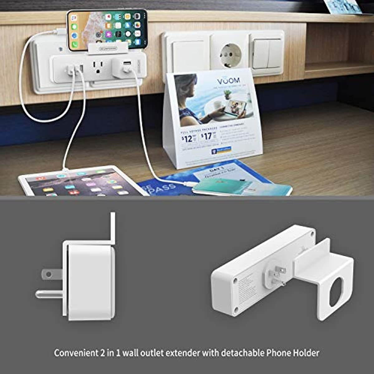 Compact Size & Phone HolderCruise cabin outlets may be close to the vanity and mounted with ground pin up. This may not leave enough space to plug in tall outlet taps. With the convenient phone holder design problem solved!