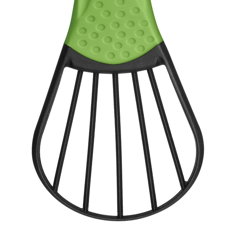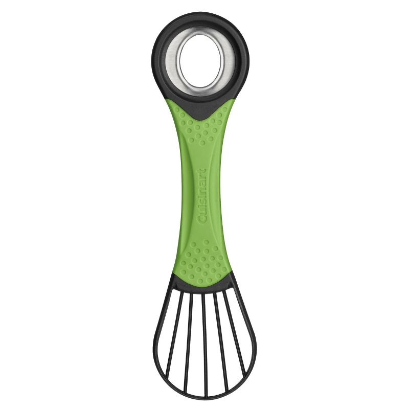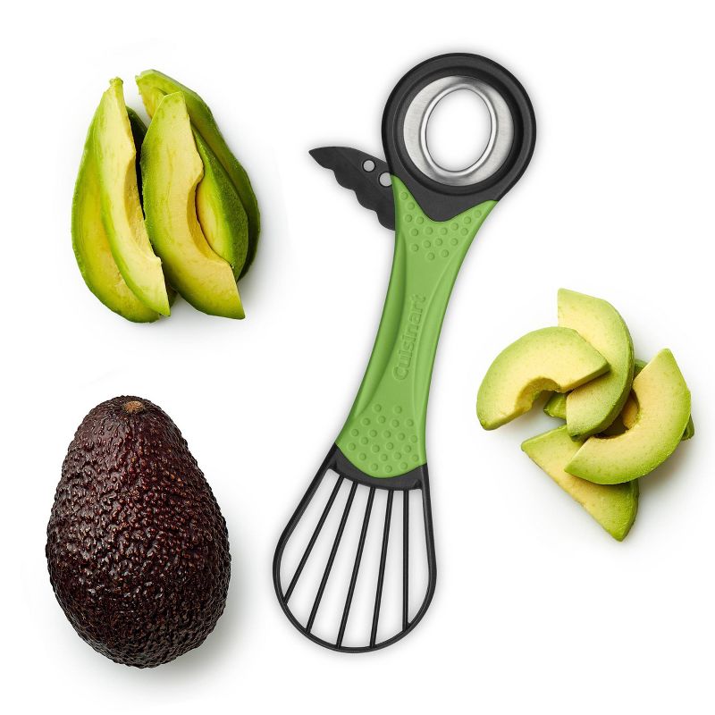 Quickly and easily cut, pit and slice avocados with the Cuisinart 3-in-1 Avocado Tool! A retractable blade easily slices through avocado skin, durable stainless steel teeth easily remove the pit, and the fanned blades give you perfect slices of avocado! The retractable blade stores inside the soft-grip, nonslip handle and features a built-in herb stripper!
