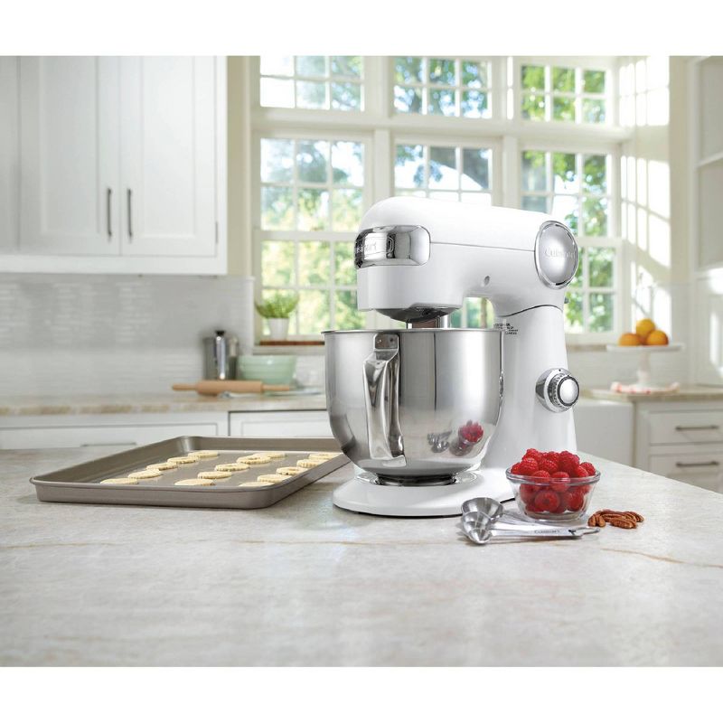 Delivering power, precision and performance, our newest stand mixer features a 500-watt motor, die-cast metal construction, and 12 speeds that allow for nuance and excellence in performing a variety of preparation tasks. The unit's tilt-back head allows for easy access to its 5.5-quart mixing bowl, while the included splash guard prevents messy countertops. Also included are a chef's whisk, dough hook, and flat mixing paddle. The mixing bowl and all accessories are dishwasher safe. Additionally, you can purchase a variety of attachments for the unit: a pasta roller and cutter set, pasta extruder, meat grinder, and frozen dessert maker.