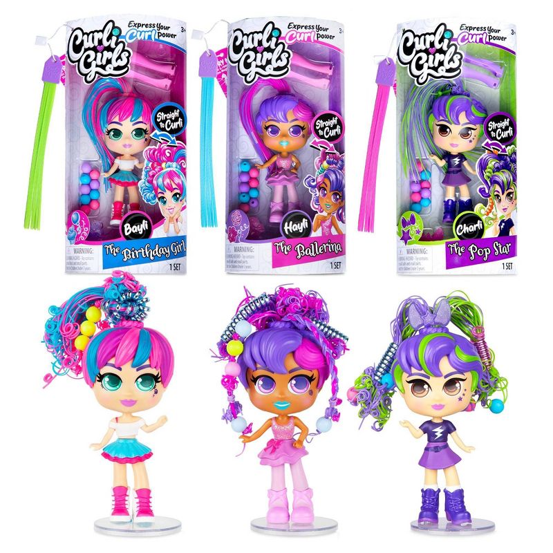 •Includes 1 CurliGirls Doll with MagiCurl Hair, 1 curling tool, 1 bow c-clip, 9 beads, 6 hair bands