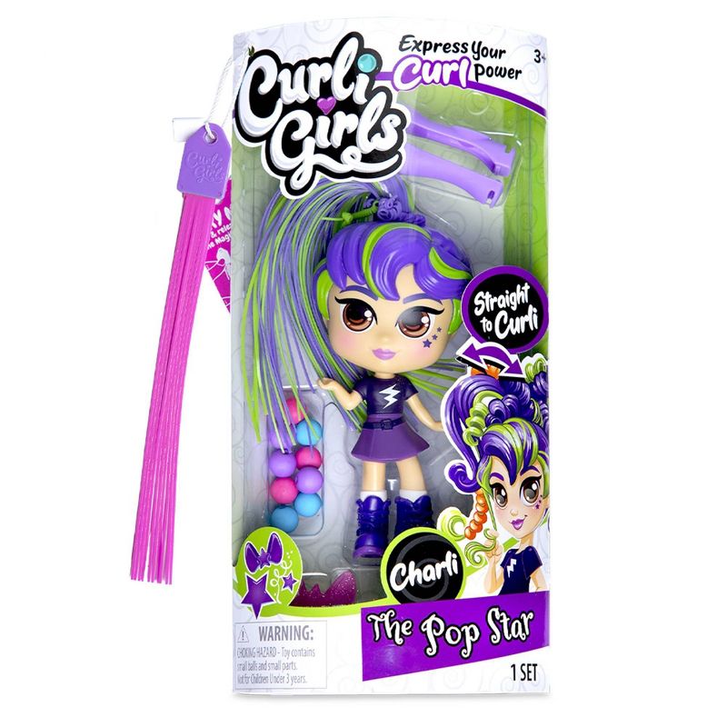 Straight or curly? CurliGirls don’t have to choose! Brand new CurliGirls dolls feature MagiCurl hair that curls instantly when you pull it. The longer you pull, the tighter the curl – it’s so easy! Curl with your fingers, or easy styling tools, then accessorize with hair clips and beads. Ready to change it up? Dip hair in warm water and watch it magically straighten! Then style and restyle over and over again. The styling possibilities are endless. Charli, the Pop Star, is pretty quiet - except when she's rocking out on stage! She's a rebel with a heart of gold. Charli comes with a special curling tool, a rock-star bow hair clip, plus plenty of beads to create endless styles - how many can you create?? For ages 3 and up.