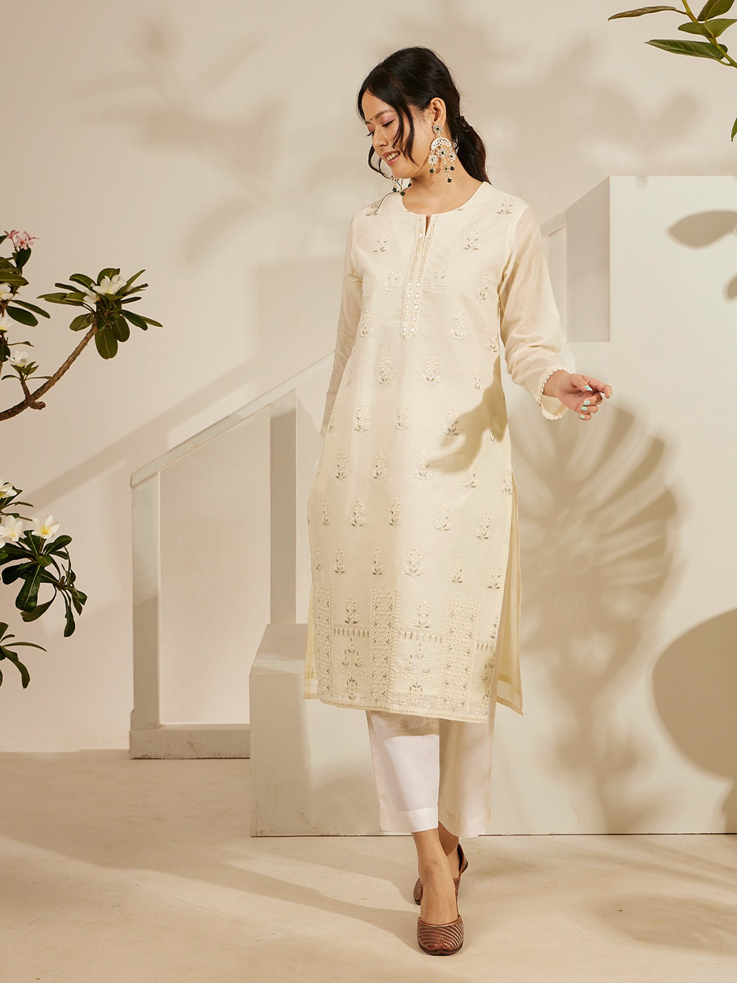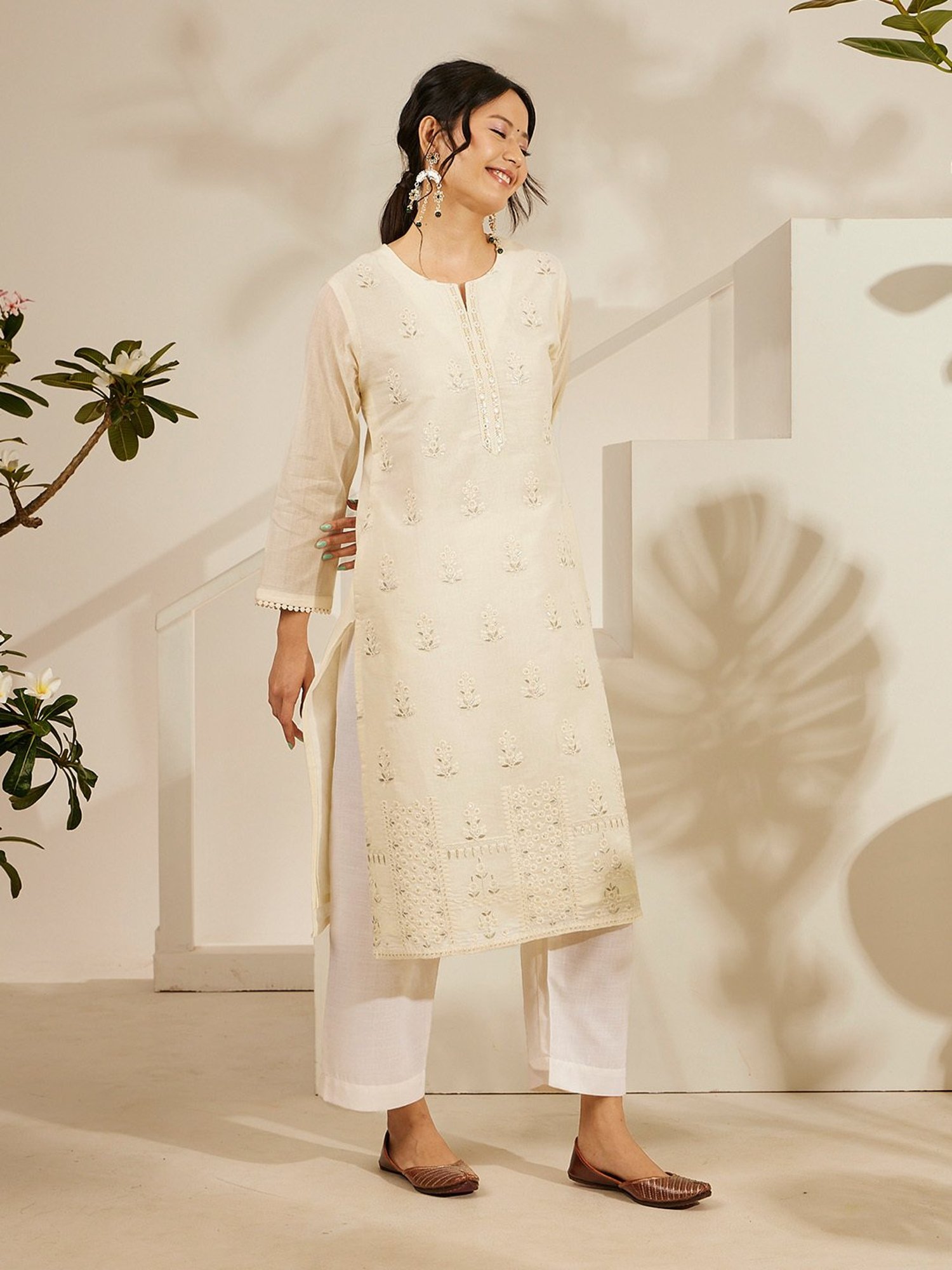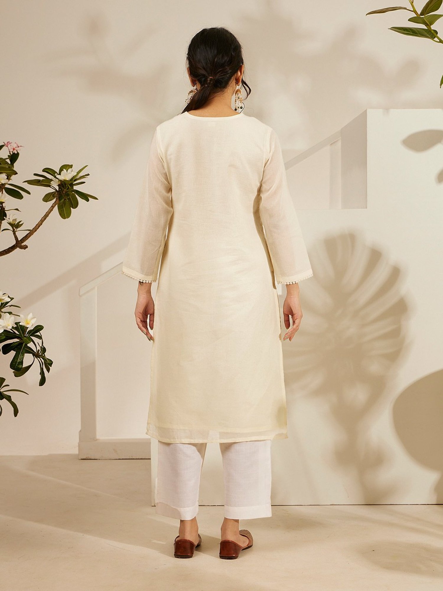 Introducing this off-white mul fabric kurta: a timeless piece crafted for elegance and comfort. With a straight silhouette, it features a round neck adorned with embroidered off-white lace and an inverted box pleat at the center front. The front is embellished with self-color cotton thread embroidery, while the 3/4 sleeves are highlighted with ladder lace plaiting and cotton thread detailing at the hem. Complete with pockets on both sides, it's a perfect blend of sophistication and practicality.