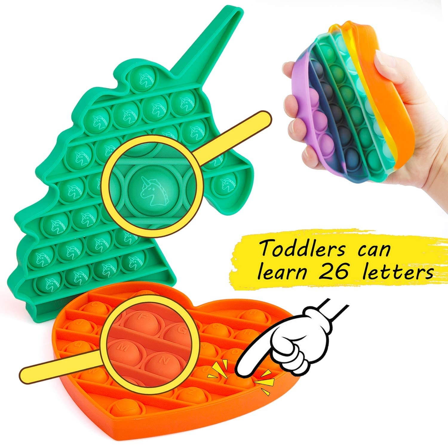 Keep happy?: These push pop up it fidget toys can effectively relieve anxiety and stress providing great sensory interaction, Make people happy. for children, adults, elderly, autism, anxiety, ADHD is helpful. Push pop pop bubble fidget sensory toy is also a learning toy for children. It would be great for smaller kids to learn their alphabet too and can make a game of finding the right letters! ?Our
