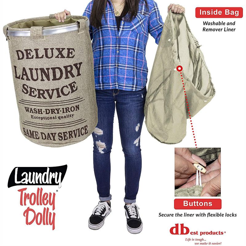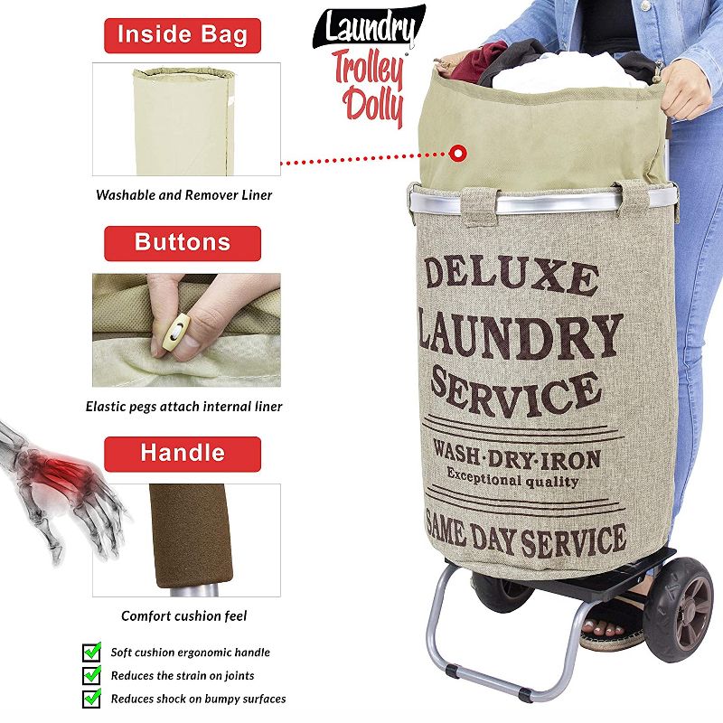 Make your next trip to the Laundromat a breeze with the Laundry Trolley Dolly from dbest products. This hamper set includes a fabric laundry container with old-fashioned lettering on the front that fits onto the wheeled laundry cart.