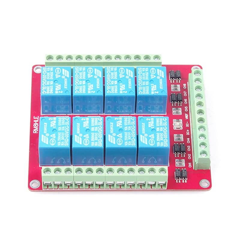 open interface maximum load: AC 250V / 10A, DC 30V / 10A; Using high-power high-voltage transistor 2907A, strong driving capability, stable performance; trigger current 5mA; Module working voltage DC 5V; The relay pull-low, the module contains a current-limiting resistor, low / high level can be DC-, microcontroller I / O port can also be set low; Fault-tolerant design, even if the control line is broken, the relay will not move; Power indicator (red), 8 relay status indicator (blue); User-friendly interface design, all interfaces can be directly connected leads, very convenient;
