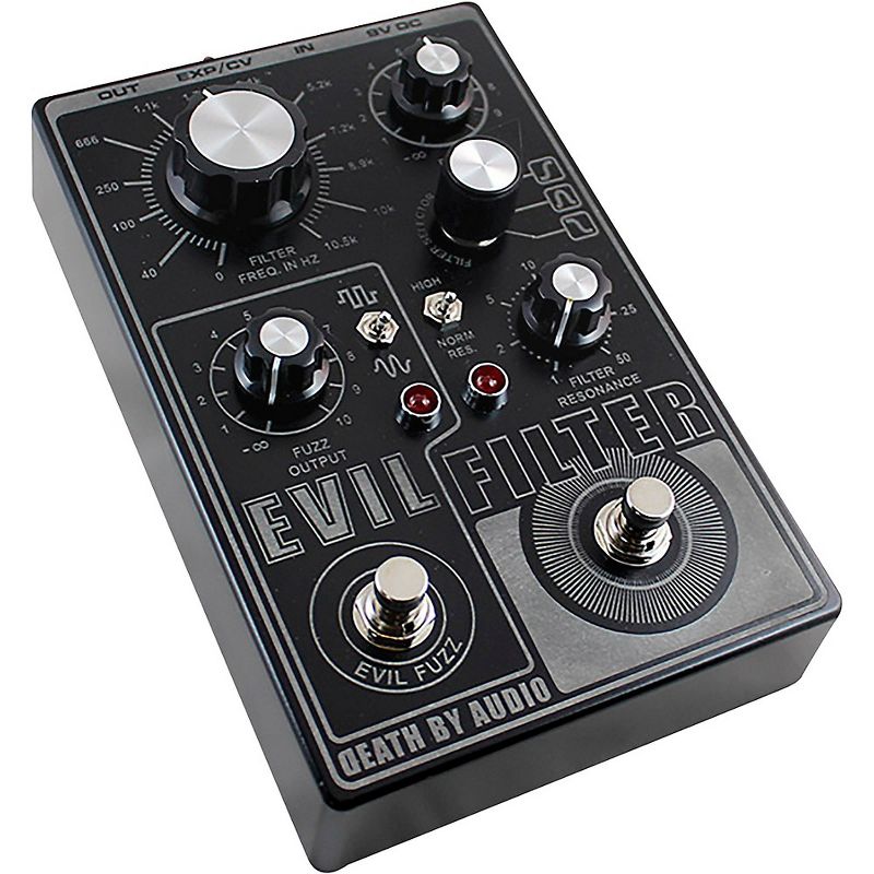 The Evil Filter takes an IC chip built for medical testing equipment and warps it into a mutated, psychotic pro-grade High-Pass, Band-Pass, and Low-Pass filter with expression/CV control and a built-in fuzz that plays nicely with recording rig, modular synth setup, guitar, bass, keyboard, other effects on pedalboard, or anything else that needs a second helping of evil. At its craziest, the Evil Filter whips up wild upper and lower octaves, twisted folding attack envelopes collapsing back in on themselves like velvet bows playing a song for all eternity, whistling resonant EQs, and diabolical self-oscillation. Back off the controls and ’ll hear organic synth-like filters lively with analog warmth, ultra-funky wah-wah effects, pinched glam rock lead guitar tones, or just a surly, insane fuzz paired up with The-Filter-Section-To-End-All-Filter-Sections. Sweeten signal with a static filter and fuzz or add favorite expression pedal (or CV) to unleash wicked filter sweeps and insane wah effects. What Does a Multimode Filter Pedal Do?The Evil Filter takes signal and carves it up so that only hear the frequencies want to play with. In High-Pass mode, ’ll hear frequencies above where the Filter Freq. control is positioned. In B and-Pass mode, the Evil Filter chops off the high and low frequencies, leaving with a midrange signal that has a round, vocal-like character, similar to a wah. In Low-P ass mode, only bass frequencies below the Filter Freq. control come through, so feel the rumble in soul. The Filter Resonance control adjusts the width and “ringiness” of the filter, which sets the overall tonal quality of the pedal from being a subtle tone-shaping utility or a harbinger of sonic devastation. At lower settings, the filter acts on a wide range of frequencies for gentle rolling sweeps and conventional filter sounds. As bring up the Resonance, the affected frequencies get narrower and narrower until it eventually clamps down on such a tiny range of frequencies that it boosts them into ringing peaks, earth-shaking subharmonic pulses, and screaming self-oscillation. For extra harmonics and oscillation, flip the Resonance toggle switch from Normal to High and freak out. Enter the Evil FuzzMisery loves company, so the Evil Filter is equipped with an Evil Fuzz to take the signal to a much darker dimension. The Evil Fuzz has its own footswitch so can use it as a standalone full-on fuzz, or pair it with the Evil Filter to push the medical-grade IC past its limit to develop potent new sonic concoctions to push sound to the limit. The Evil Fuzz has two fuzz types: takes from a rich fuzz that cleans up nicely with volume control, and is an over-the-top fire-breathing scorcher that dishes out disgustingly amazing blasted-out fuzz. Evil Filter Everywhere Evil Filter packs so much explosive sound into a single pedal that ’ll want to use it for everything from clean guitars to intense industrial sound-mangling. Rhythm guitars? Patch in the Evil Filter and use the High-Pass filter to remove muddy low-end and sculpt ideal sound. Recording a solo? Try using the Band-Pass filter to find the perfect frequencies so fit in the mix. Bass? Crank the Resonance and sweep the Low-Pass filter for gutsy synth-bass filter sweeps that’ll have bandmates looking for synth rig. And if have a modular synth, the Evil Filter offers CV/expression input to control the filter cutoff frequency in tempo using a synthesizer or expression pedal.